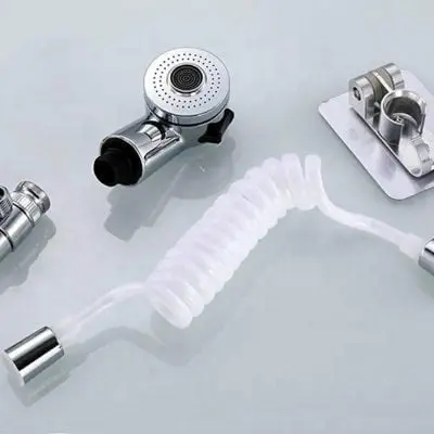 Material: nerjaveče jeklo (ventil in obešalnik) + plastika (slušalka in cev)