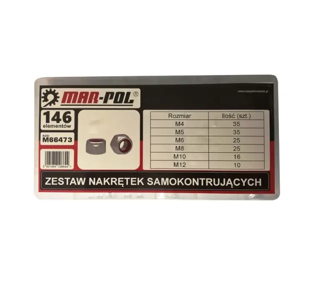 Komplet protimatice z najlonsko tesnilno maso. metrični navoj, velikosti: M4, M5, M6, M8, M10, M12 najlonski vložki samozaklepanje plastična posoda s praktičnimi predelki M4 – 35 kos M5 – 35 kos M6 – 25 kos M8 – 25 kos M10 – 16 kos M12 – 10 kos