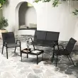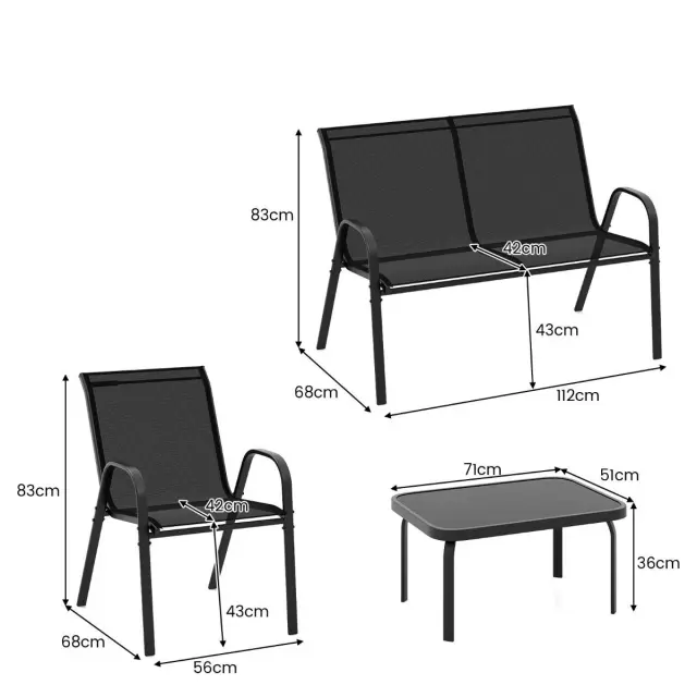 Ta zunanji pogovorni set, ki ga sestavljata 2 fotelja, sedežna garnitura in mizica za kavo, je skrbno izdelan z robustnim kovinskim okvirjem, ki vzdrži veliko težo. Sedeži, ki so oblikovani z visokokakovostno in hitro sušečo se tkanino, vzdržijo dolgotrajno uporabo na prostem in zagotavljajo udobje. Poleg tega zložljivi enojni stoli učinkovito prihranijo prostor, ko jih ne uporabljate. Ta komplet z dobro izdelanimi podrobnostmi, ki je idealen za različne zunanje prostore, od vrtov do balkonov, bo vaše zunanje prostore spremenil v elegantno in vabljivo oazo.