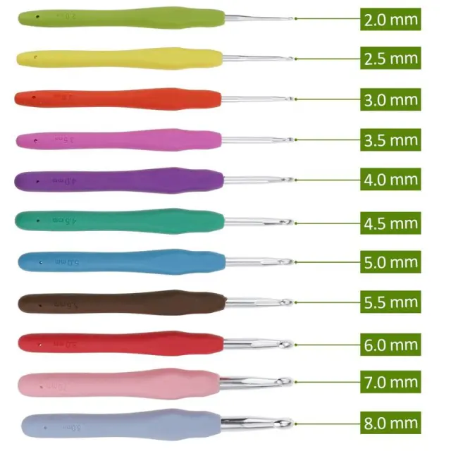 Celoten set kvačkanj: set kvačkanj z ergonomskimi mehkimi ročaji, v velikostih: 2 mm, 2,5 mm, 3 mm, 3,5 mm, 4 mm, 4,5 mm, 5 mm, 5,5 mm, 6 mm, 6,5 mm, 7 mm, 8 mm. Kvačkarski komplet za različne potrebe kvačkanja, barvno kodiran in s poliranim kavljem za gladko kvačkanje.