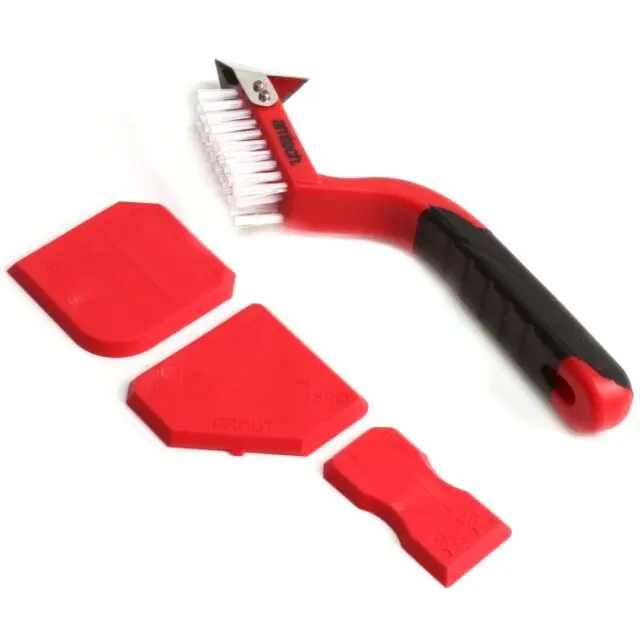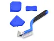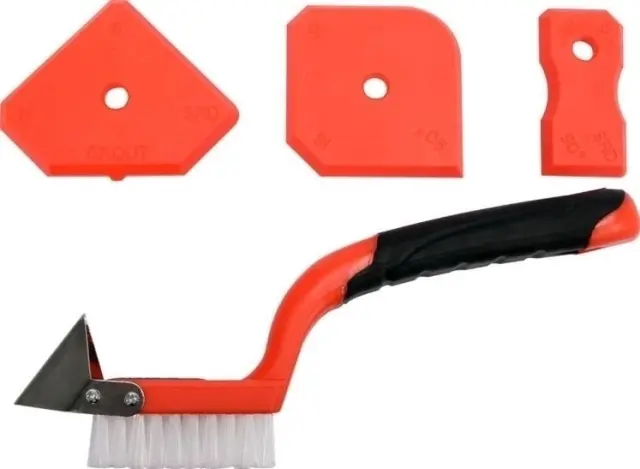 Komplet treh TPR plastičnih gladilk za nanašanje in glajenje sveže silikonske ali akrilne mase. Lopatice imajo konice različnih širin, ki ustrezajo širini različnih fug in robove, odrezane pod različnimi koti. Priložena krtača s trdimi najlonskimi ščetinami omogoča čiščenje in odstranjevanje starega materiala. Poleg tega je opremljen s kovinskim strgalom za odstranjevanje drobcev trdega materiala.