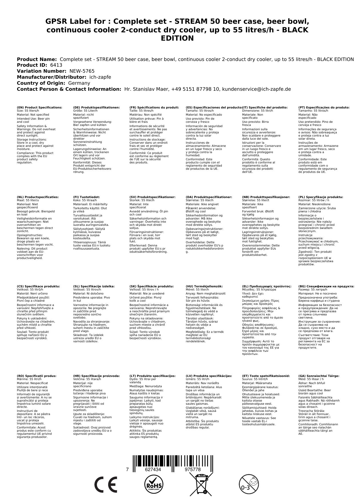 Tehnične specifikacije vključujejo moč 421 W pri 230 V / 50 Hz, teža 32 kg in mere 225 x 330 x 425 mm. Set vsebuje suhi hladilnik, regulator tlaka CO2 za dve liniji na 3 bar, jeklenko CO2 2 kg, dve cevi CO2 po 1,5 m, dve pivski cevi John Guest, ventil za karbonizacijo, dva izbirna točilna ventila, kompenzator za hlajenje in dodatno opremo.