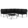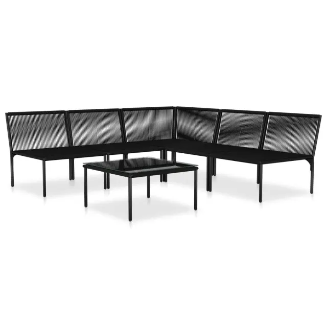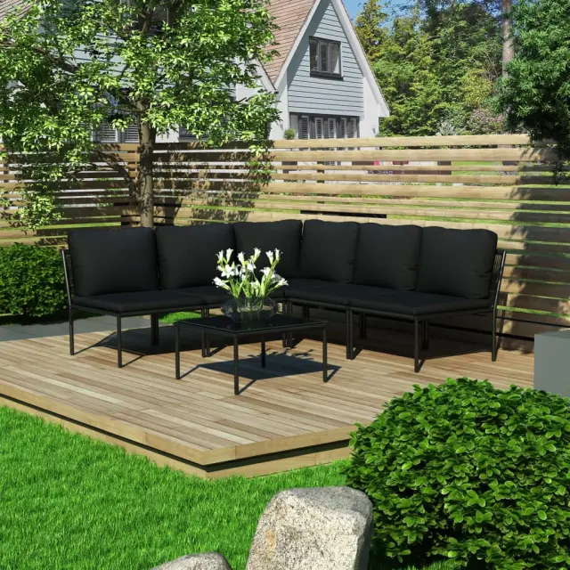Ta vrtna garnitura predstavlja kombinacijo stila in funkcionalnosti, zato bo prava zvezda vašega vrta. Celoten komplet pohištva je ustvarjen za celoletno uporabo na prostem. Zaradi trdnega okvirja iz jekla s prašnim premazom in na vremenske vplive odporne PVC žice je sedežna garnitura izjemno vzdržljiva, trpežna in preprosta za čiščenje. Odstranljive blazine so debelo podložene in mehke, kar zagotavlja največje udobje pri sedenju. Vsi sekcijski deli so lahki in modularni, zato so povsem prilagodljivi in enostavni za premikanje, podali pa se bodo k vsaki postavitvi. Potrebna je sestava. Opomba: Priporočamo, da garnituro pokrijete v primeru dežja, snega ali zmrzali.Barva: Črna in antracitnaMaterial: PVC, jeklo s prašnim premazom, blago (100 % poliester), kaljeno stekloCelotne dimenzije: 190 x 190 x 65 cm (D x Š x V)Dimenzije kotnega kavča: 70 x 70 x 65 cm (D x Š x V)Dimenzije sredinskega kavča: 60 x 70 x 65 cm (D x Š x V)Dimenzije klubske mizice: 60 x 60 x 32 cm (D x Š x V)Število oseb: 5Z debelo podloženimi blazinamiZ žičnim dizajnomPotrebno sestavljanje: DaPaket vsebuje:1 x Kotni kavč4 x Sredinski kavč1 x Klubska mizica5 x Blazina za sedež6 x Blazina za hrbet