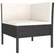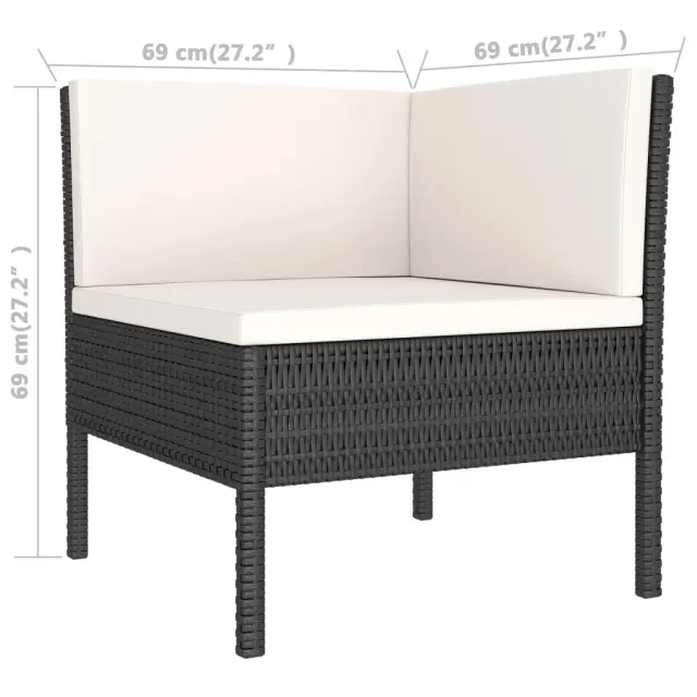 S to vrtno sedežno garnituro za teraso lahko ustvarite privlačen in sproščen prostor za počivanje, o katerem ste vedno sanjali. Na tem kompletu vrtnega pohištva boste lahko ob sončnih popoldnevih ali poletnih večerih uživali s svojo družino ali prijatelji! Ta garnitura je sestavljena iz 6 kosov, zato jo boste lahko postavili po želji in ustvarili kombinacije, ki so vam všeč. Izdelana je iz trpežnega PE ratana, pod katerim je prašno premazan jeklen okvir, zato je ta garnitura močna, trpežna in odporna na vremenske vplive. Zahvaljujoč vremensko odpornemu PE ratanu je počivalna garnitura enostavna za čiščenje, trpežna in primerna za vsakodnevno uporabo. Debelo podložene blazine in izjemno globoka moderna sedišča zagotavljajo, da se boste vedno veselili sprostitve na tej garnituri. Klubska mizica je idealna za odlaganje hrane in pijače, da bo vedno pri roki. Zaradi lahke in modularne zasnove lahko garnituro brez težav premikate po hiši. Opomba: Priporočamo, da komplet pokrijete v primeru dežja, snega in zmrzali.Barva: ČrnaBarva blazine: Kremno belaMaterial: PE ratan, jeklo s prašnim premazom, blago (100 % poliester)Dimenzije kotnega kavča: 69 x 69 x 69 cm (Š x G x V)Dimenzije sredinskega kavča: 57 x 69 x 69 cm (Š x G x V)Velikost sedeža: 57 x 57 cm (Š x G)Višina sedeža, merjena od tal: 35 cmDimenzije čajne mizice: 60 x 60 x 35 cm (Š x G x V)Potrebno sestavljanje: DaPaket vsebuje:2 x Sredinski kavč2 x Kotni kavč2 x Mizica4 x Blazina za sedež6 x Blazina za hrbet