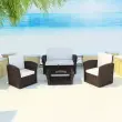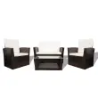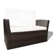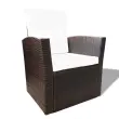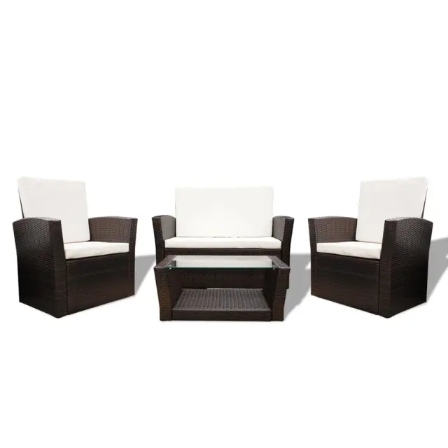 Naš stilski komplet vrtnega pohištva iz ratana bo prava zvezda vašega vrta ali verande! Ta jedilni komplet elegantne oblike bo odlična izbira za večerjanje ali sproščanje na vrtu. Jeklen okvir zagotavlja, da so miza, fotelja in kavč močni in čvrsti. Zahvaljujoč lahki konstrukciji so vsi kosi pohištva enostavni za premikanje. PE ratan je odporen na vremenske vplive in vodo, zato je ta vrtna garnitura preprosta za čiščenje. Tudi steklena površina mize omogoča preprosto čiščenje z vlažno krpo. Debele in mehke blazine so polnjene s peno. So zelo udobne, narejene pa so iz vodoodbojnega poliestra. Odstranljive in pralne prevleke imajo zadrge. Paket vsebuje 1 klubsko mizico, 2 fotelja, 1 kavč dvosed in 6 blazin. Opomba: Priporočamo, da komplet pokrijete v primeru dežja, snega in zmrzali.Barva ratana: RjavaBarva blazine: Kremno belaMaterial: Jeklen okvir s prašnim premazom + PE ratan + steklena površina miziceMaterial prevlek za blazine: 100 % poliesterDebelina blazine za sedež: 7 cmDebelina blazine za hrbet: 5 cmDimenzije klubske mizice: 85 x 49,5 x 35 cm (D x Š x V)Dimenzije fotelja: 75 x 66 x 87,5 cm (Š x G x V)Širina sedeža: 52 cmGlobina sedeža: 52 cmVišina sedeža, merjena od tal: 44 cmVišina naslonjala za roke, merjena od tal: 72 cmDimenzije dvoseda: 125 x 66 x 87,5 cm (Š x G x V)Širina sedeža: 102 cmGlobina sedeža: 52 cmVišina sedeža, merjena od tal: 44 cmVišina naslonjala za roke, merjena od tal: 72 cmPaket vsebuje:1 x Klubska mizica1 x Kavč dvosed2 x Naslanjač3 x Blazina za sedež3 x Blazina za hrbet