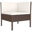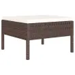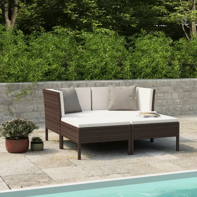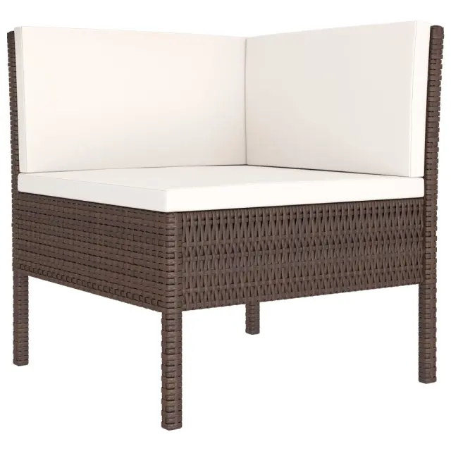 S to vrtno sedežno garnituro za teraso lahko ustvarite privlačen in sproščen prostor za počivanje, o katerem ste vedno sanjali. Na tem kompletu vrtnega pohištva boste lahko ob sončnih popoldnevih ali poletnih večerih uživali s svojo družino ali prijatelji! Ta garnitura je sestavljena iz 4 kosov, zato jo boste lahko postavili po želji in ustvarili kombinacije, ki so vam všeč. Izdelana je iz trpežnega PE ratana, pod katerim je prašno premazan jeklen okvir, ta garnitura je močna, trpežna in odporna na vremenske vplive. Zahvaljujoč vremensko odpornemu PE ratanu je počivalna garnitura enostavna za čiščenje, trpežna in primerna za vsakodnevno uporabo. Debelo podložene blazine in izjemno globoka moderna sedišča zagotavljajo, da se boste vedno veselili sprostitve na tej garnituri. Zaradi lahke in modularne zasnove lahko garnituro brez težav premikate po hiši. Opomba: Priporočamo, da komplet pokrijete v primeru dežja, snega in zmrzali.Barva: RjavaBarva blazine: Kremno belaMaterial: PE ratan, jeklo s prašnim premazom, blago (100 % poliester)Dimenzije kotnega kavča: 69 x 69 x 69 cm (Š x G x V)Velikost sedeža: 57 x 57 cm (Š x G)Višina sedeža, merjena od tal: 35 cmDimenzije naslonjala za noge: 60 x 60 x 35 cm (D x Š x V)Potrebno sestavljanje: DaPaket vsebuje:2 x Kotni kavč2 x Stolček za noge4 x Blazina za hrbet4 x Blazina za sedež