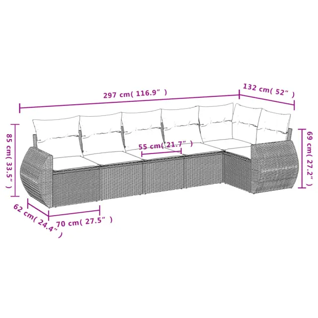 Ta vrtna sedežna garnitura je popoln dodatek za vaše dvorišče, teraso ali verando, saj zagotavlja udoben in vabljiv prostor za klepet z družino in prijatelji ali preprosto za sprostitev in uživanje na prostem. Vzdržljiv material: PE ratan, znan tudi kot poli ratan, je močan sintetični material, ki zahteva malo vzdrževanja in je videti kot naravni ratan. Je lahek, enostaven za čiščenje in se zaradi svoje vzdržljivosti in odpornosti na vremenske vplive pogosto uporablja za zunanje pohištvo. Udobno sedenje: To zunanje pohištvo z debelo oblazinjenimi blazinami zagotavlja udobno sedenje.Prevleko je mogoče odstraniti in oprati: Te sedežne blazine imajo odstranljive prevleke za lažje pranje in vzdrževanje.Modularna zasnova: Ta komplet zunanjega pohištva ima modularno zasnovo, zaradi česar je popolnoma prilagodljiv in enostaven za premikanje, tako da lahko zunanjo garnituro postavite kakor koli želite.Robusten in stabilen okvir: Prašno barvan jekleni okvir zagotavlja, da je vrtno pohištvo močno in stabilno za vsakodnevno uporabo na prostem. Dobro je vedeti:Če želite, da vaše zunanje pohištvo ostane lepo, vam priporočamo, da ga zaščitite z vodoodporno prevleko.Maksimalna nosilnost (na sedež): 110 kgUV-odpornoPotrebno sestavljanje: DaKotni sedež:Barva: ČrnaMaterial: PE ratan, jeklen okvir s prašnim premazomDimenzije: 62 x 62 x 69 cm (Š x G x V)Velikost sedeža: 55 x 55 cm (Š x G)Višina sedeža, merjena od tal: 37 cmSrednji sedež:Barva: ČrnaMaterial: PE ratan, jeklen okvir s prašnim premazomDimenzije: 55 x 62 x 69 cm (Š x G x V)Velikost sedeža: 55 x 55 cm (Š x G)Višina sedeža, merjena od tal: 37 cmKavč z naslonjali za roke:Barva: ČrnaMaterial: PE ratan, jeklen okvir s prašnim premazomDimenzije: 71 x 62 x 69 cm (Š x G x V)Velikost sedeža: 55 x 55 cm (Š x G)Višina sedeža, merjena od tal: 37 cmVišina naslonjal za roke od tal: 55 cmBlazina:Barva: Kremno bela Material prevleke: Tkanina (100 % poliester)Polnilo sedežne blazine: PenaPolnilo hrbtne blazine: bombažna vlaknaDimenzije sedežne blazine: 55 x 55 x 3 cm (Š x G x D)Dimenzije hrbtne blazine: 55 x 45 x 13 cm (D x Š x D)Paket vsebuje:1 x Kotni sedež3 x Srednji sedež2 x Kavč z naslonjali za roke7 x Hrbtna blazina6 x Blazina za sedež