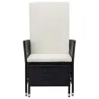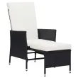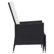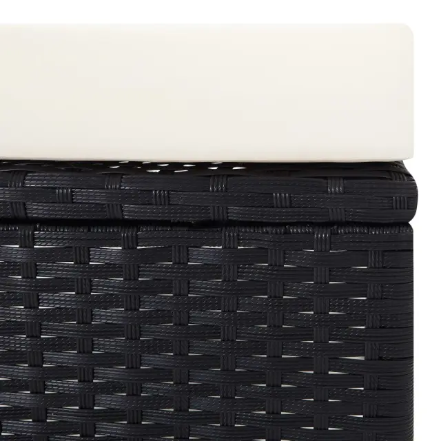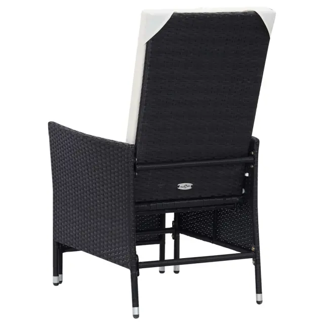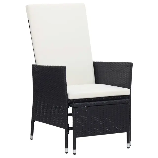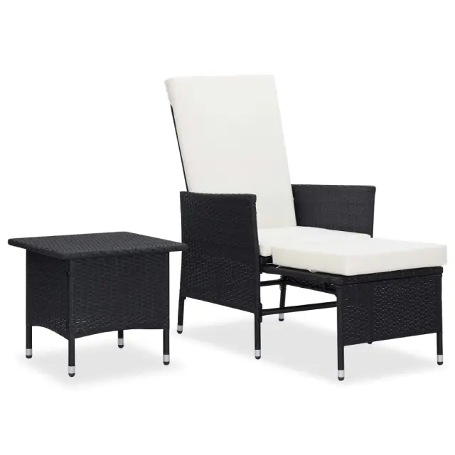 Ta trendovski komplet pohištva nudi optimalno udobje za uživanje v lepem vremenu in sproščanje na vrtu ali terasi. Naslanjač in čajna mizica sta izdelana iz PE ratana, zato sta trpežna, preprosta za čiščenje in primerna za vsakodnevno uporabo. Ta zunanja počivalna garnitura ima prašno premazan jeklen okvir, zato je močna in stabilna ter primerna za večletno uporabo. Debelo podložene blazine nudijo udobno sedenje, vgrajeno naslonjalo za noge pa zagotavlja dodatno udobje med sproščanjem. Priložena mizica je idealna za odlaganje košar s sadjem, pijače, hrane in drugih okrasnih stvari, da bodo na dosegu roke. Opomba: Priporočamo, da garnituro pokrijete v primeru dežja, snega in zmrzali, da podaljšate njeno življenjsko dobo.Barva poli ratana: ČrnaBarva blazine: Kremno belaMaterial: PE ratan, jeklo s prašnim premazom, blago (100 % poliester)Dimenzije naslanjača: 62 x 131 x 106 cm (Š x G x V)Dimenzije mizice: 50 x 50 x 45 cm (Š x G x V)Velikost sedeža: 52 x 48 cm (Š x G)Višina sedeža, merjena od tal: 40 cmDebelina blazine za sedež: 5 cmZ naslonjalom za nogePotrebno sestavljanje: DaPaket vsebuje:1 x Naslanjač1 x Blazina za sedež1 x Blazina za hrbet1 x Blazina za noge1 x Klubska mizica