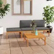 Ta lesena vrtna sedežna garnitura, ki izstopa z elegantnim dizajnom in mehkimi blazinami, se odlično poda na vaš vrt, teraso ali verando. Primeren je za klepetanje z družino in prijatelji ali pa samo za uživanje v lepem vremenu. Ta komplet pohištva iz izjemno trpežne tikovine je bil sušen na zraku, sušen v peči in nato fino brušen za pridobivanje gladkega izgleda. Tikovina je znana po svoji izjemni moči in odpornosti na vremenske vplive, zato je izmed vseh vrst lesa najbolj primerna za vrtno pohištvo. Tikovina je popolna izbira, če želite kupiti dolgotrajen kos vrtnega pohištva. Brušena površina je preprosta za čiščenje z vlažno krpo. Debelo podložene sedežne in hrbtne blazine ter priložen stolček za noge dodajajo izjemno udobje. Mizica je idealna za odlaganje pijače in hrane. Opomba: Da bi podaljšali življenjsko dobo vašega zunanjega pohištva, vam priporočamo, da ga zaščitite z vodoodporno prevleko.Barva blazine: SivaMaterial: Fino brušena trdna tikovina s premazom na vodni osnovi, blago (100 % poliester)Dimenzije srednjega kavča: 63 x 66 x 60 cm (Š x G x V)Dimenzije mize: 63 x 63 x 30 cm (Š x G x V)Dimenzije stolčka za noge: 62,5 x 62,5 x 30 cm (Š x G x V)Debelina sedežne blazine: 5 cmDebelina blazine za hrbet: 15 cmPotrebno sestavljanje: DaPaket vsebuje:2 x Sredinski kavč1 x Miza1 x Stolček za noge3 x Blazina za sedež2 x Blazina za hrbet