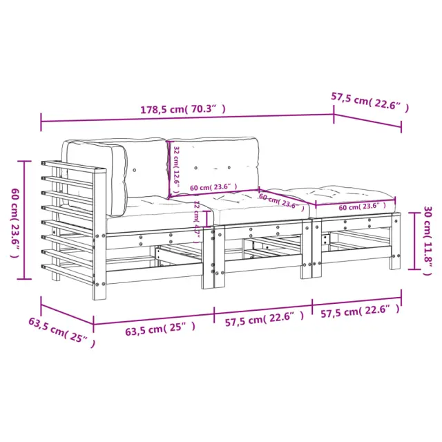 Ta lesena vrtna sedežna garnitura, ki jo odlikujejo letve in mehke blazine, bo odličen dodatek za vaš vrt, teraso ali teraso za prijetno druženje z družino ali prijatelji. Trdna borovina: Trdna borovina je čudovit naravni material. Borovina ima ravne vzorce, grče pa dajejo materialu njegov značilen, rustikalen videz.Vzdržljiv in stabilen okvir: Leseni okvir zagotavljajo trdnost sedežne garniture za vsakodnevno uporabo na prostem.Udobna izkušnja sedenja: Naslonjalo za hrbet in naslonjalo za roke zagotavljata dodatno udobje pri sedenju na vrtnem pohištvu.Poleg tega debelo podložena blazine zagotavljajo udobje med sedenjem.Modularna zasnova: Sedežna garnitura je prilagodljiva in enostavna za premikanje.Kombinirate jo lahko z drugimi modularnimi segmenti v spletni trgovini ter tako ustvarite vrtno sedežno garnituro po lastnih željah! Dobro je vedeti:Če želite, da vaše zunanje pohištvo ostane lepo, vam priporočamo, da ga zaščitite z vodoodporno prevleko.Barva: SivaMaterial: Trdna borovinaMaterial letvic: Vezan lesDimenzije sredinskega kavča: 57,5 x 63,5 x 60 cm (D x Š x V)Dimenzije kotnega kavča: 63,5 x 63,5 x 60 cm (D x Š x V)Dimenzije vrtnega stolčka za noge: 57,5 x 57,5 x 30 cm (D x Š x V)Maksimalna nosilnost (na sedež): 110 kgBlazina:Barva: ČrnaMaterial prevleke: Tkanina OxfordMaterial polnila: PP bombažDimenzije blazine za sedež: 60 x 60 x 12 cm (D x Š x D)Dimenzije blazine za hrbet: 60 x 32 x 12 cm (D x Š x D)Potrebno sestavljanje: DaPaket vsebuje:1 x Sredinski kavč1 x Kotni kavč1 x Stolček za noge/klubska mizica3 x Blazina za sedež3 x Blazina za hrbet Največ 110 kg na sedež.