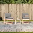 Ta lesena vrtna sedežna garnitura ima eleganten dizajn in je odlična izbira za sprostitev in uživanje na vrtu ali terasi. Trden les douglas: Zunanja sedežna garnitura je izdelana iz trdnega lesa douglas za trdnost in stabilnost. Trden les douglas je zelo trpežen les, ki se dobro obnese na prostem. Les douglas je tudi dovolj močan ter ne potrebuje veliko vzdrževanja, tudi pod vplivom vremenskih vplivov.Zasnova iz letev: Zasnova iz letev lesenega kompleta za počivanje preprečuje nabiranje vode, ohranja sedež suh in preprečuje nepotrebno gnitje.Široka uporaba: Vrtno sedišče je popolno za vsako verando, teraso, dvorišče, zelenico, vrt itd. Dobro je vedeti:Če želite, da vaše zunanje pohištvo ostane lepo, vam priporočamo, da ga zaščitite z vodoodporno prevleko.Miza:Material: Trden les douglas (neobdelan)Dimenzije: 40 x 38 x 28,5 cm (Š x G x V)Vrtni stol:Material: Trden les douglas (neobdelan)Dimenzije: 50,5 x 55 x 77 cm (Š x G x V)Višina sedeža od tal: 39 cmMaksimalna nosilnost (na sedež): 90 kgPotrebno sestavljanje: DaPaket vsebuje:1 x Vrtna miza2 x Vrtni stol Največ 110 kg na sedež.
