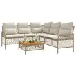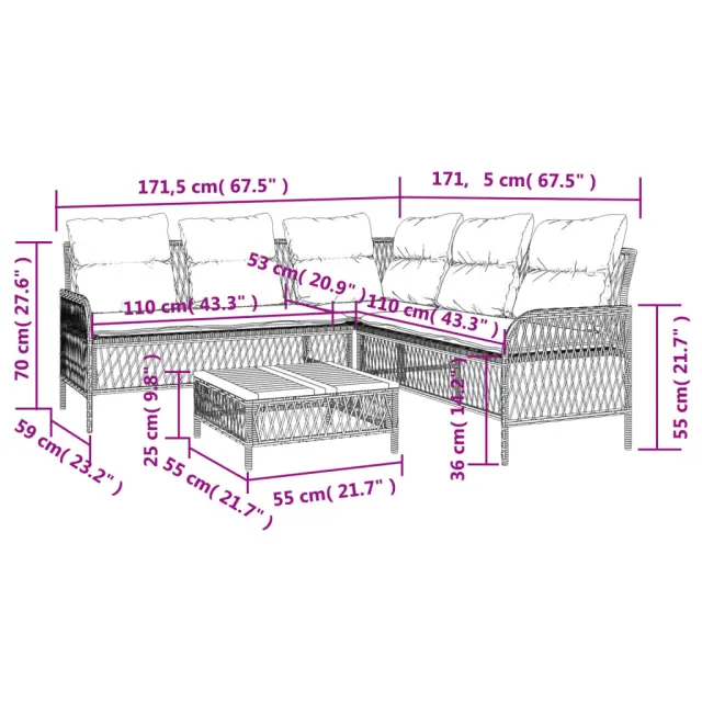 Ta vrtna sedežna garnitura je popoln dodatek za vaše dvorišče, teraso ali verando, saj zagotavlja udoben in vabljiv prostor za klepet z družino in prijatelji ali preprosto za sprostitev in uživanje na prostem. Vzdržljiv material: PE ratan, znan tudi kot poli ratan, je močan sintetični material, ki zahteva malo vzdrževanja in je videti kot naravni ratan. Je lahek, enostaven za čiščenje in se zaradi svoje vzdržljivosti in odpornosti na vremenske vplive pogosto uporablja za zunanje pohištvo.Robusten in stabilen okvir: Prašno barvan jekleni okvir zagotavlja, da je vrtno pohištvo močno in stabilno za vsakodnevno uporabo na prostem.Udobno sedenje: To zunanje pohištvo z debelo oblazinjenimi blazinami zagotavlja udobno sedenje.Prevleko je mogoče odstraniti in oprati: Te sedežne blazine imajo odstranljive prevleke za lažje pranje in vzdrževanje.Stabilna mizna plošča, ki je enostavna za čiščenje: Ta vrtna miza ima ploščo iz akacijevega lesa, ki je čvrsta, vzdržljiva in jo je enostavno čistiti z vlažno krpo. Dobro je vedeti:Če želite, da vaše zunanje pohištvo ostane lepo, vam priporočamo, da ga zaščitite z vodoodporno prevleko.Maksimalna nosilnost (na sedež): 110 kgUV-odpornoPotrebno sestavljanje: DaKavč v obliki črke L:Barva: BežMaterial: PE ratan, jeklen okvir s prašnim premazomCelotne dimenzije: 171,5 x 171,5 x 70 cm (Š x G x V)Globina sedeža: 53 cmVišina sedeža, merjena od tal: 36 cmVišina naslonjal za roke od tal: 55 cmKlubska mizica:Barva: BežMaterial: PE ratan, prašno premazano jeklo, trden akacijev les z oljnim premazomDimenzije: 55 x 55 x 25 cm (Š x G x V)Blazina:Barva: Kremno belaMaterial prevleke: Tkanina (100 % poliester)Polnilo hrbtne blazine: bombažna vlaknaPolnilo sedežne blazine: PenaDimenzije blazine za hrbet: 46,5 x 47 x 10 cm (Š x G x D)Dimenzije sedežne blazine (dvosed): 110 x 53 x 3 cm (Š x G x D)Dimenzije sedežne blazine: 53 x 53 x 3 cm (Š x G x D)Paket vsebuje:1 x Kavč L oblike1 x Klubska mizica6 x Sedežna blazina s snemljivo pralno prevleko6 x Blazina za hrbet
