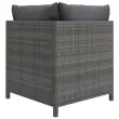 S to vrtno sedežno garnituro lahko ustvarite privlačen in sproščen prostor za počivanje, o katerem ste vedno sanjali. Na tem kompletu vrtnega pohištva boste lahko ob sončnih popoldnevih ali poletnih večerih uživali s svojo družino ali prijatelji! Zunanja sedežna garnitura iz vremensko odpornega PE ratana je preprosta za čiščenje in vzdrževanje. Jeklen okvir s prašnim premazom garnituri dodaja stabilnost in trdnost. Zunanji komplet pohištva je opremljen z debelimi in mehkimi blazinami ter nudi izjemno udobje. Poliestrske prevleke so odstranljive in pralne. Zahvaljujoč lahkemu in modularnemu dizajnu lahko to garnituro z lahkoto premikate okrog hiše. Opomba: Da bi podaljšali življenjsko dobo vašega zunanjega pohištva, vam priporočamo, da ga zaščitite z vodoodporno prevleko.Barva: SivaBarva blazin: AntracitnaMaterial: PE ratan, jekloMaterial blazine: Tkanina (100 % poliester)Dimenzije kotnega kavča: 60 x 60 x 60 cm (Š x G x V)Velikost kotnega sedeža: 57 x 57 cm (Š x G)Dimenzije sredinskega kavča: 54 x 60 x 60 cm (Š x G x V)Velikost srednjega sedeža: 54 x 57 cm (Š x G)Višina sedeža, merjena od tal: 32 cmDebelina sedežne blazine: 5 cmDebelina hrbtne / stranske blazine: 15 cmPotrebno sestavljanje: DaPaket vsebuje:1 x Kotni kavč2 x Sredinski kavč3 x Blazina za sedež4 x Blazina za hrbet/stranska blazina