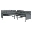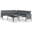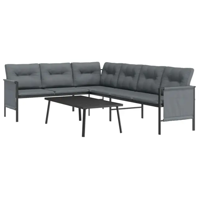 Ta stilska in udobna vrtna sedežna garnitura je idealna izbira za sproščanje in uživanje v vremenu, dremanje ali klepetanje s prijatelji ali družino. Stabilen okvir: Jeklo je izjemno trd in močan material. Ponuja trdnost in stabilnost. Prašni premaz in e-premaz na jeklu ustvarita zaščitno plast pred obrabo in korozijo.Stabilen okvir: Jeklen okvir s prašnim premazom in e-premazom zagotavlja trdnost in stabilnost sedežne garniture.Udobno sedenje: Debelo podložene blazine so zelo udobne ter zagotavljajo bolj udobno sedenje.Praktična mizna plošča: Robustna mizna plošča zunanje mize je kot nalašč za postavitev jedi, pijač in drugih okrasnih predmetov.Stranska torba za shranjevanje: V stranskih vrečah za shranjevanje so vaši osnovni predmeti dobro organizirani in na dosegu roke. Opomba:Če želite, da vaše zunanje pohištvo ostane lepo, vam priporočamo, da ga zaščitite z vodoodporno prevleko.Vrtni kotni kavč:Barva: AntracitnaMaterial: Jeklo (obdelano z e-premazom in prašnim premazom), tekstilenDimenzije: 230 x 168 x 65 cm (Š x G x V)Velikost sedeža: 110 x 55 cm (Š x G)Višina sedeža od tal (brez blazine): 35 cmVišina naslonjal za roke od tal: 55 cmKlubska mizica:Barva: AntracitnaMaterial: Jeklo (obdelano z e-premazom in prašnim premazom)Dimenzije: 110 x 55 x 35 cm (D x Š x V)Blazina:Barva: Temno sivaMaterial prevleke: Tkanina (100 % poliester)Polnilo sedežne blazine: PenaPolnilo hrbtne blazine: PP bombažDimenzije sedežne blazine: 110 x 55 x 3,5 cm (D x Š x D)Dimenzije hrbtne blazine: 46 x 43 x 3,5 cm (D x Š x D)Velikost stranske torbe za shranjevanje: 55 x 40 cm (Š x V)Potrebno sestavljanje: DaPaket vsebuje:1 x Vrtni kotni kavč1 x Klubska mizica3 x Blazina za sedež7 x Hrbtna blazina2 x Stranska torba za shranjevanje Maksimalna teža na sedež: 110 kg. Bodite pozorni na tveganje odprtega ognja in druge vire močne toplote v bližini izdelka.