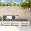 Ta lesena vrtna sedežna garnitura z letvicami bo odličen dodatek za vaš vrt, verando ali teraso za prijetno druženje z družino ali prijatelji. Trdna borovina: Trdna borovina je čudovit naravni material. Borovina ima ravne vzorce, grče pa dajejo materialu njegov značilen, rustikalen videz. Vzdržljiv in stabilen okvir: Leseni okvir zagotavljajo trdnost sedežne garniture za vsakodnevno uporabo na prostem. Udobna izkušnja sedenja: Naslonjala za hrbet in roke zagotavljajo dodatno udobje pri sedenju na garnituri vrtnega pohištva. Modularna zasnova: Zunanja sedežna garnitura je prilagodljiva in enostavna za premikanje. Kombinirate ga lahko z drugimi modularnimi segmenti, ki so na voljo v spustnem meniju, in tako ustvarite svoje osebne konfiguracije vrtne sedežne garniture! Dobro je vedeti:Če želite, da vaše zunanje pohištvo ostane lepo, vam priporočamo, da ga zaščitite z vodoodporno prevleko. Barva: BelaMaterial: Trdna borovinaCelotne dimenzije: 183 x 61 x 62 cm (Š x G x V)Dimenzije vrtnega kotnega kavča: 61 x 61 x 62 cm (Š x G x V) Dimenzije vrtnega sredinskega kavča: 61 x 60,5 x 62 cm (Š x G x V) Dimenzije vrtnega stolčka za noge: 61 x 60,5 x 30 cm (Š x G x V) Višina sedeža (vsakega): 60 x 60 cm (Š x G)Maksimalna nosilnost (na sedež): 110 kg Dostava ne vključuje blazinePotrebno sestavljanje: Da Paket vsebuje:1 x Vrtni kotni kavč 1 x Vrtni srednji kavč 1 x Vrtni stolček za noge Največ 110 kg na sedež.