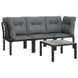 Elegantna in sodobna vrtna sedežna garnitura je popolna izbira za obedovanje ali sproščanje na vašem vrtu. Vremensko odporen material: PE ratan, znan tudi kot poli ratan, je odporen na vremenske vplive in enostaven za čiščenje. Na zunaj ostane lep dolgo časa. Ponuja odlično kakovost, priročnost in estetski videz. Trpežen in stabilen okvir: Prašno premazan jeklen okvir sedežne garniture zagotavlja trdnost in stabilnost.Udobna izkušnja sedenja: Naslonjalo za hrbet zagotavlja dodatno udobje pri sedenju na stolu. Poleg tega debelo podložene blazine zagotavljajo udobje med sedenjem.Modularna zasnova: Zunanja sedežna garnitura je prilagodljiva in enostavna za premikanje, zato jo lahko kombinirate z drugimi modularnimi segmenti iz spletne trgovine in ustvarite svoj osebni sestav vrtne sedežne garniture!Praktična miza: Robustna mizna plošča klubske mizice je odlična za odlaganje hrane, pijače in okrasnih stvari. Dobro je vedeti:Za čim lažjo montažo je vsakemu izdelku priložen priročnik.Opomba:Če želite, da vaše zunanje pohištvo ostane lepo, vam priporočamo, da ga zaščitite z vodoodporno prevleko.Klubska mizica:Material: DPC, prašno barvano jekloDimenzije: 55 x 55 x 31 cm (D x Š x V)Kotni stol:Barva: ČrnaMaterial: PE ratan, tekstilen, prašno lakirano jekloDimenzije: 62 x 62 x 68 cm (Š x G x V)Velikost sedeža: 55 x 55 cm (Š x G)Višina sedeža, merjena od tal: 31 cmMaksimalna nosilnost (na sedež): 110 kgEnojni stol:Barva: ČrnaMaterial: PE ratan, tekstilen, prašno lakirano jekloDimenzije: 55 x 62 x 68 cm (Š x G x V)Velikost sedeža: 55 x 55 cm (Š x G)Višina sedeža, merjena od tal: 31 cmMaksimalna nosilnost: 110 kgBlazina:Barva blazin: Temno sivaMaterial prevlek za blazine: Tkanina (100 % poliester)Polnilo sedežne blazine: PenaPolnilo hrbtne blazine: PP bombažDimenzije hrbtne blazine: 55 x 45 x 12 cm (D x Š x D)Dimenzije sedežne blazine: 55 x 55 x 3,5 cm (D x Š x D)Paket vsebuje:1 x Klubska mizica2 x Kotni stol1 x Enojni stol3 x Blazina za sedež5 x Blazina za hrbet Maksimalna teža na sedež: 110 kg. Bodite pozorni na tveganje odprtega ognja in druge vire močne toplote v bližini izdelka.