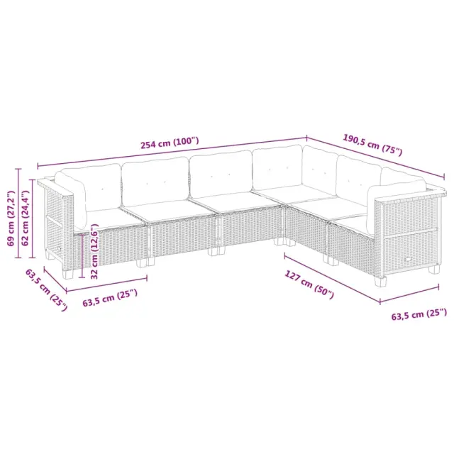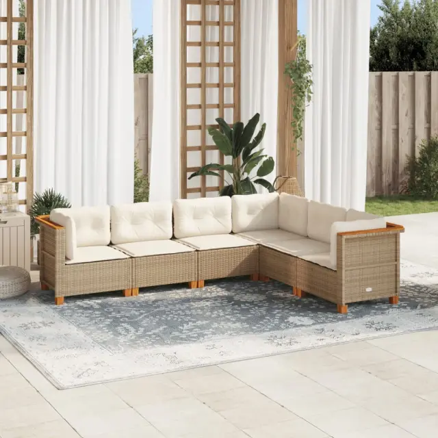 Ta vrtna sedežna garnitura je popoln dodatek za vaše dvorišče, teraso ali verando, saj zagotavlja udoben in vabljiv prostor za klepet z družino in prijatelji ali preprosto za sprostitev in uživanje na prostem. Vzdržljiv material: PE ratan, znan tudi kot poli ratan, je močan sintetični material, ki zahteva malo vzdrževanja in je videti kot naravni ratan. Je lahek, enostaven za čiščenje in se zaradi svoje vzdržljivosti in odpornosti na vremenske vplive pogosto uporablja za zunanje pohištvo.Udobno sedenje: To zunanje pohištvo z debelo oblazinjenimi blazinami zagotavlja udobno sedenje.Prevleko je mogoče odstraniti in oprati: Te sedežne blazine imajo odstranljive prevleke za lažje pranje in vzdrževanje.Modularna zasnova: Ta komplet zunanjega pohištva ima modularno zasnovo, zaradi česar je popolnoma prilagodljiv in enostaven za premikanje, tako da lahko zunanjo garnituro postavite kakor koli želite. Dobro je vedeti:Če želite, da vaše zunanje pohištvo ostane lepo, vam priporočamo, da ga zaščitite z vodoodporno prevleko.Maksimalna nosilnost (na sedež): 110 kgUV-odpornoLesene nogePotrebno sestavljanje: DaKotni sedež:Barva: BežMaterial: PE ratan, jeklo s prašnim premazom, trden akacijev les z naravnim oljnim premazomDimenzije: 63,5 x 63,5 x 62 cm (Š x G x V)Velikost sedeža: 56 x 56 cm (Š x G)Višina sedeža, merjena od tal (brez blazine): 32 cmSrednji sedež:Barva: BežMaterial: PE ratan, jeklo s prašnim premazom, trden akacijev les z naravnim oljnim premazomDimenzije: 63,5 x 63,5 x 62 cm (Š x G x V)Velikost sedišča: 63 x 56 cm (Š x G)Višina sedeža, merjena od tal (brez blazine): 32 cmBlazina:Barva: Kremno belaMaterial prevleke: Tkanina (100 % poliester)Polnilo sedežne blazine: PenaPolnilo hrbtne blazine: bombažna vlaknaDimenzije sedežne blazine (kotna): 56,5 x 56,5 x 3 cm (Š x G x D)Dimenzije sedežne blazine (sredinska): 63,5 x 56,5 x 3 cm (Š x G x D)Dimenzije hrbtne blazine (kotna): 52 x 35 x 10 cm (D × Š × D)Dimenzije hrbtne blazine (sredinska): 63 x 35 x 10 cm (D x Š x D)Paket vsebuje:3 x Kotni kavč3 x Srednji sedež9 x Blazina za hrbet6 x Sedežna blazina s snemljivo pralno prevleko Maksimalna teža na sedež: 110 kg. Bodite pozorni na tveganje odprtega ognja in druge vire močne toplote v bližini izdelka.