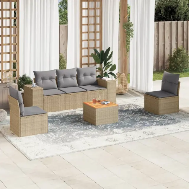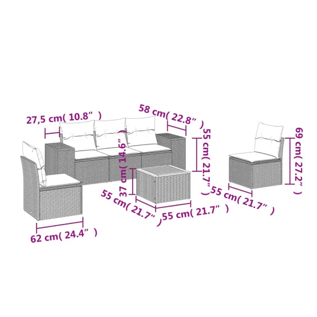 Ta vrtna sedežna garnitura je popoln dodatek za vaše dvorišče, teraso ali verando, saj zagotavlja udoben in vabljiv prostor za klepet z družino in prijatelji ali preprosto za sprostitev in uživanje na prostem. Vzdržljiv material: PE ratan, znan tudi kot poli ratan, je močan sintetični material, ki zahteva malo vzdrževanja in je videti kot naravni ratan. Je lahek, enostaven za čiščenje in se zaradi svoje vzdržljivosti in odpornosti na vremenske vplive pogosto uporablja za zunanje pohištvo. Funkcija shranjevanja z vodoodporno vrečo: Vsak vrtni sedež ima prostor za shranjevanje pod sedežem, skupaj z vodoodporno vrečo za shranjevanje blazin, igrač in drugih predmetov. Notranje vreče imajo zgornjo prevleko in jih je mogoče s pomočjo primenjal varno pritrditi na sedeže za dodatno varnost. Stabilna mizna plošča, ki je enostavna za čiščenje: Ta vrtna miza ima ploščo iz akacijevega lesa, ki je čvrsta, vzdržljiva in jo je enostavno čistiti z vlažno krpo. Udobno sedenje: To zunanje pohištvo z debelo oblazinjenimi blazinami zagotavlja udobno sedenje. Modularna zasnova: Ta komplet zunanjega pohištva ima modularno zasnovo, zaradi česar je popolnoma prilagodljiv in enostaven za premikanje, tako da lahko zunanjo garnituro postavite kakor koli želite. Dobro je vedeti:Če želite, da vaše zunanje pohištvo ostane lepo, vam priporočamo, da ga zaščitite z vodoodporno prevleko.Maksimalna nosilnost (na sedež): 110 kgUV-odpornoPotrebno sestavljanje: DaSrednji sedež:Barva: BežMaterial: PE ratan, jeklen okvir s prašnim premazomDimenzije: 55 x 62 x 69 cm (Š x G x V)Velikost sedeža: 55 x 55 cm (Š x G)Višina sedeža, merjena od tal: 37 cmKavč z naslonjali za roke:Barva: BežMaterial: PE ratan, jeklen okvir s prašnim premazomDimenzije: 83 x 62 x 69 cm (Š x G x V)Velikost sedeža: 55 x 55 cm (Š x G)Višina sedeža, merjena od tal: 37 cmVišina naslonjal za roke od tal: 55 cmMiza:Barva: BežMaterial: PE ratan, prašno premazano jeklo, trden akacijev les z oljnim premazomDimenzije: 55 x 55 x 37 cm (D x Š x V)Blazina:Barva: Svetlo sivaMaterial prevleke: Tkanina (100 % poliester)Polnilo sedežne blazine: PenaPolnilo hrbtne blazine: bombažna vlaknaDimenzije sedežne blazine: 55 x 55 x 3 cm (Š x G x D)Dimenzije hrbtne blazine: 55 x 45 x 13 cm (D x Š x D)Paket vsebuje:3 x Srednji kavč s funkcijo shranjevanja z vodoodporno vrečo2 x Kavč s funkcijo shranjevanja z vodoodporno vrečo1 x Vrtna miza5 x Blazina za hrbet5 x Sedežna blazina s snemljivo pralno prevleko