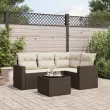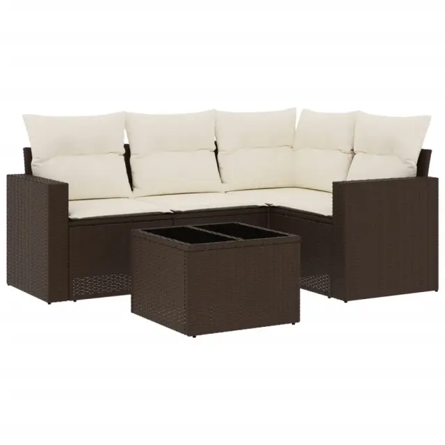 Ta vrtna sedežna garnitura je popoln dodatek za vaše dvorišče, teraso ali verando, saj zagotavlja udoben in vabljiv prostor za klepet z družino in prijatelji ali preprosto za sprostitev in uživanje na prostem. Vzdržljiv material: PE ratan, znan tudi kot poli ratan, je močan sintetični material, ki zahteva malo vzdrževanja in je videti kot naravni ratan. Je lahek, enostaven za čiščenje in se zaradi svoje vzdržljivosti in odpornosti na vremenske vplive pogosto uporablja za zunanje pohištvo.Udobno sedenje: To zunanje pohištvo z debelo oblazinjenimi blazinami zagotavlja udobno sedenje. Široki nasloni za roke so tudi priročen prostor za mobilni telefon, skodelice ali druge manjše predmete, da jih lahko zlahka dosežete.Prevleko je mogoče odstraniti in oprati: Te sedežne blazine imajo odstranljive prevleke za lažje pranje in vzdrževanje.Steklena mizna plošča: Površina zunanje mize je izdelana iz močnega in trpežnega kaljenega stekla, kar omogoča enostavno čiščenje z vlažno krpo in vašemu zunanjemu prostoru doda pridih elegance.Modularna zasnova: Ta komplet zunanjega pohištva ima modularno zasnovo, zaradi česar je popolnoma prilagodljiv in enostaven za premikanje, tako da lahko zunanjo garnituro postavite kakor koli želite. Dobro je vedeti:Če želite, da vaše zunanje pohištvo ostane lepo, vam priporočamo, da ga zaščitite z vodoodporno prevleko.Maksimalna nosilnost (na sedež): 110 kgUV-odpornoPlastične nastavljive nogePotrebno sestavljanje: DaKotni sedež s širokim naslonom za roke:Barva: RjavaMaterial: PE ratan, jeklen okvir s prašnim premazomDimenzije: 65,5 x 62 x 69 cm (Š x G x V)Velikost sedeža: 55 x 55 cm (Š x G)Višina sedeža, merjena od tal: 37 cmVišina naslonjal za roke od tal: 55 cmŠirina naslonjala za roke: 10 cmKotni sedež:Barva: RjavaMaterial: PE ratan, jeklen okvir s prašnim premazomDimenzije: 62 x 62 x 69 cm (Š x G x V)Velikost sedeža: 55 x 55 cm (Š x G)Višina sedeža, merjena od tal: 37 cmSrednji sedež:Barva: RjavaMaterial: PE ratan, jeklen okvir s prašnim premazomDimenzije: 55 x 62 x 69 cm (Š x G x V)Velikost sedeža: 55 x 55 cm (Š x G)Višina sedeža, merjena od tal: 37 cmMiza:Barva: RjavaMaterial: PE ratan, jeklo s prašnim premazom, kaljeno stekloDimenzije: 55 x 55 x 37 cm (Š x G x V)Blazina:Barva: Kremno belaMaterial prevleke: Tkanina (100 % poliester)Polnilo sedežne blazine: PenaPolnilo hrbtne blazine: bombažna vlaknaDimenzije sedežne blazine: 55 x 55 x 3 cm (Š x G x D)Dimenzije hrbtne blazine: 55 x 45 x 13 cm (D x Š x D)Paket vsebuje:2 x Kotni sedež s širokim naslonom za roke1 x Kotni sedež1 x Sredinski sedež1 x Miza5 x Blazina za hrbet4 x Sedežna blazina s snemljivo in pralno prevleko