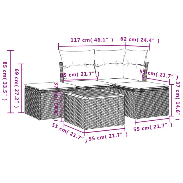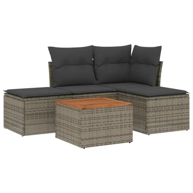 Ta vrtna sedežna garnitura je popoln dodatek za vaše dvorišče, teraso ali verando, saj zagotavlja udoben in vabljiv prostor za klepet z družino in prijatelji ali preprosto za sprostitev in uživanje na prostem. Vzdržljiv material: PE ratan, znan tudi kot poli ratan, je močan sintetični material, ki zahteva malo vzdrževanja in je videti kot naravni ratan. Je lahek, enostaven za čiščenje in se zaradi svoje vzdržljivosti in odpornosti na vremenske vplive pogosto uporablja za zunanje pohištvo.Udobno sedenje: To zunanje pohištvo z debelo oblazinjenimi blazinami zagotavlja udobno sedenje.Stabilna mizna plošča, ki je enostavna za čiščenje: Ta vrtna miza ima ploščo iz akacijevega lesa, ki je čvrsta, vzdržljiva in jo je enostavno čistiti z vlažno krpo.Prevleko je mogoče odstraniti in oprati: Te sedežne blazine imajo odstranljive prevleke za lažje pranje in vzdrževanje.Modularna zasnova: Ta komplet zunanjega pohištva ima modularno zasnovo, zaradi česar je popolnoma prilagodljiv in enostaven za premikanje, tako da lahko zunanjo garnituro postavite kakor koli želite. Dobro je vedeti:Če želite, da vaše zunanje pohištvo ostane lepo, vam priporočamo, da ga zaščitite z vodoodporno prevleko.Maksimalna nosilnost (na sedež): 110 kgUV-odpornoPlastične nastavljive nogePotrebno sestavljanje: DaKotni sedež:Barva: SivaMaterial: PE ratan, jeklen okvir s prašnim premazomDimenzije: 62 x 62 x 69 cm (Š x G x V)Velikost sedeža: 55 x 55 cm (Š x G)Višina sedeža, merjena od tal: 37 cmSrednji sedež:Barva: SivaMaterial: PE ratan, jeklen okvir s prašnim premazomDimenzije: 55 x 62 x 69 cm (Š x G x V)Velikost sedeža: 55 x 55 cm (Š x G)Višina sedeža, merjena od tal: 37 cmMiza:Barva: Siva in rjavaMaterial: PE ratan, prašno premazano jeklo, trden akacijev les z oljnim premazomDimenzije: 55 x 55 x 37 cm (D x Š x V)Stolček za noge:Barva: SivaMaterial: PE ratan, jeklen okvir s prašnim premazomDimenzije: 55 x 55 x 37 cm (Š x G x V)Blazina:Barva: Temno sivaMaterial prevleke: Tkanina (100 % poliester)Polnilo sedežne blazine: PenaPolnilo hrbtne blazine: bombažna vlaknaDimenzije sedežne blazine: 55 x 55 x 3 cm (Š x G x D)Dimenzije hrbtne blazine: 55 x 45 x 13 cm (D x Š x D)Paket vsebuje:1 x Vrtna miza1 x Kotni kavč1 x Sredinski kavč2 x Vrtni stolček za noge3 x Blazina za hrbet4 x Sedežna blazina s snemljivo in pralno prevleko