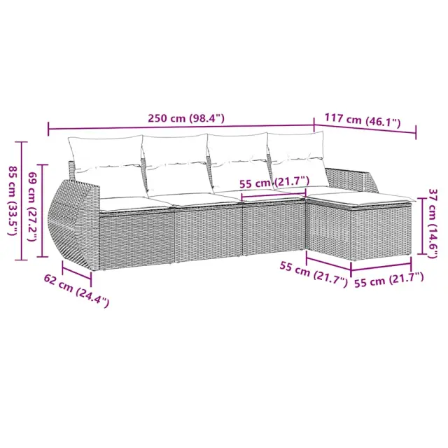 Ta vrtna sedežna garnitura je popoln dodatek za vaše dvorišče, teraso ali verando, saj zagotavlja udoben in vabljiv prostor za klepet z družino in prijatelji ali preprosto za sprostitev in uživanje na prostem. Vzdržljiv material: PE ratan, znan tudi kot poli ratan, je močan sintetični material, ki zahteva malo vzdrževanja in je videti kot naravni ratan. Je lahek, enostaven za čiščenje in se zaradi svoje vzdržljivosti in odpornosti na vremenske vplive pogosto uporablja za zunanje pohištvo. Udobno sedenje: To zunanje pohištvo z debelo oblazinjenimi blazinami zagotavlja udobno sedenje.Prevleko je mogoče odstraniti in oprati: Te sedežne blazine imajo odstranljive prevleke za lažje pranje in vzdrževanje.Modularna zasnova: Ta komplet zunanjega pohištva ima modularno zasnovo, zaradi česar je popolnoma prilagodljiv in enostaven za premikanje, tako da lahko zunanjo garnituro postavite kakor koli želite.Robusten in stabilen okvir: Prašno barvan jekleni okvir zagotavlja, da je vrtno pohištvo močno in stabilno za vsakodnevno uporabo na prostem. Dobro je vedeti:Če želite, da vaše zunanje pohištvo ostane lepo, vam priporočamo, da ga zaščitite z vodoodporno prevleko.Maksimalna nosilnost (na sedež): 110 kgUV-odpornoPotrebno sestavljanje: DaSrednji sedež:Barva: Svetlo sivaMaterial: PE ratan, jeklen okvir s prašnim premazomDimenzije: 55 x 62 x 69 cm (Š x G x V)Velikost sedeža: 55 x 55 cm (Š x G)Višina sedeža, merjena od tal: 37 cmKavč z naslonjali za roke:Barva: Svetlo sivaMaterial: PE ratan, jeklen okvir s prašnim premazomDimenzije: 70 x 62 x 69 cm (Š x G x V)Velikost sedeža: 55 x 55 cm (Š x G)Višina sedeža, merjena od tal: 37 cmVišina naslonjal za roke od tal: 55 cmStolček za noge:Barva: Svetlo sivaMaterial: PE ratan, jeklen okvir s prašnim premazomDimenzije: 55 x 55 x 37 cm (Š x G x V)Velikost sedeža: 55 x 55 cm (Š x G)Višina sedeža, merjena od tal: 37 cmBlazina:Barva: Antracitna Material prevleke: Tkanina (100 % poliester)Polnilo sedežne blazine: PenaPolnilo hrbtne blazine: bombažna vlaknaDimenzije sedežne blazine: 55 x 55 x 3 cm (Š x G x D)Dimenzije hrbtne blazine: 55 x 45 x 13 cm (D x Š x D)Paket vsebuje:2 x Sredinski sedež2 x Kavč z naslonjali za roke1 x Stolček za noge4 x Blazina za hrbet5 x Blazina za sedež