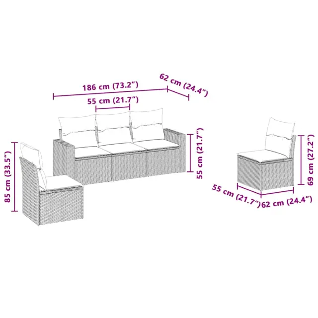 Ta vrtna sedežna garnitura je popoln dodatek za vaše dvorišče, teraso ali verando, saj zagotavlja udoben in vabljiv prostor za klepet z družino in prijatelji ali preprosto za sprostitev in uživanje na prostem. Vzdržljiv material: PE ratan, znan tudi kot poli ratan, je močan sintetični material, ki zahteva malo vzdrževanja in je videti kot naravni ratan. Je lahek, enostaven za čiščenje in se zaradi svoje vzdržljivosti in odpornosti na vremenske vplive pogosto uporablja za zunanje pohištvo.Udobno sedenje: To zunanje pohištvo z debelo oblazinjenimi blazinami zagotavlja udobno sedenje. Široki nasloni za roke so tudi priročen prostor za mobilni telefon, skodelice ali druge manjše predmete, da jih lahko zlahka dosežete.Prevleko je mogoče odstraniti in oprati: Te sedežne blazine imajo odstranljive prevleke za lažje pranje in vzdrževanje.Modularna zasnova: Ta komplet zunanjega pohištva ima modularno zasnovo, zaradi česar je popolnoma prilagodljiv in enostaven za premikanje, tako da lahko zunanjo garnituro postavite kakor koli želite. Dobro je vedeti:Če želite, da vaše zunanje pohištvo ostane lepo, vam priporočamo, da ga zaščitite z vodoodporno prevleko.Maksimalna nosilnost (na sedež): 110 kgUV-odpornoPlastične nastavljive nogePotrebno sestavljanje: DaKotni sedež:Barva: Svetlo sivaMaterial: PE ratan, jeklen okvir s prašnim premazomDimenzije: 65,5 x 62 x 69 cm (Š x G x V)Velikost sedeža: 55 x 55 cm (Š x G)Višina sedeža, merjena od tal: 37 cmVišina naslonjal za roke od tal: 55 cmŠirina naslonjala za roke: 10 cmSrednji sedež:Barva: Svetlo sivaMaterial: PE ratan, jeklen okvir s prašnim premazomDimenzije: 55 x 62 x 69 cm (Š x G x V)Velikost sedeža: 55 x 55 cm (Š x G)Višina sedeža, merjena od tal: 37 cmBlazina:Barva: Temno sivaMaterial prevleke: Tkanina (100 % poliester)Polnilo sedežne blazine: PenaPolnilo hrbtne blazine: bombažna vlaknaDimenzije sedežne blazine: 55 x 55 x 3 cm (Š x G x D)Dimenzije hrbtne blazine: 55 x 45 x 13 cm (D x Š x D)Paket vsebuje:2 x Kotni sedež3 x Srednji sedež5 x Blazina za hrbet5 x Sedežna blazina s snemljivo pralno prevleko