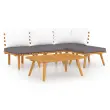 Ta lesena sedežna garnitura je odlična izbira za sproščanje in uživanje v lepem vremenu, dremanje ali klepetanje z vašo družino ali prijatelji. Ta brezčasna lesena sedežna garnitura iz letvic bo vaši verandi, terasi ali vrtu dodala rustikalen čar. Ta komplet zunanjega pohištva iz trdnega akacijevega lesa je vremensko odporen in zelo trpežen. V kombinaciji z debelo podloženimi blazinami ta sedežna garnitura za teraso zagotavlja najvišjo raven udobja. Kombinirate jo lahko tudi z drugimi modularnimi segmenti in tako ustvarite svojo lastno sedežno garnituro! Opomba: Če želite podaljšati življenjsko dobo svojega vrtnega pohištva, priporočamo redno čiščenje. Pohištva ne puščajte na prostem brez zaščite.Čiščenje: Uporabite blago milnico.Shranjevanje: Če je mogoče, shranite v hladnem in suhem notranjem prostoru. Če bo izdelek shranjen zunaj, ga zaščitite z vodoodpornim pokrivalom. Po dežju ali snegu odstranite odvečno vodo ali sneg z ravnih površin. Omogočite zadosten pretok zraka, da preprečite poškodbe povezane z vlago.Barva blazine: Temno siva, belaMaterial: Trden akacijev les, blago (100 % poliester)Dimenzije stolčka za noge: 60 x 60 x 29 cm (Š x G x V)Dimenzije mizice: 90 x 55 x 35 cm (Š x G x V)Dimenzije blazine za sedež: 54 x 58,5 x 6 cm (Š x G x D)Dimenzije hrbtne blazine: 40 x 40 x 10 cm (Š x G x D)Sredinski kavč:Dimenzije sredinskega kavča: 60 x 65 x 65 cm (Š x G x V)Globina sedeža: 60 cmVišina sedeža (brez blazine): 29 cmVišina sedeža (vključno z blazino): 35 cmKotni kavč:Dimenzije kotnega kavča: 65 x 65 x 65 cm (Š x G x V)Globina sedeža: 60 cmVišina sedeža (brez blazine): 29 cmVišina sedeža (vključno z blazino): 35 cmPotrebno sestavljanje: DaPaket vsebuje:2 x Sredinski kavč1 x Stolček za noge1 x Miza1 x Kotni kavč4 x Blazina za sedež4 x Blazina za hrbet