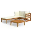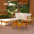Ta lesena sedežna garnitura je odlična izbira za sproščanje in uživanje v lepem vremenu, dremanje ali klepetanje z vašo družino ali prijatelji. Ta brezčasna sedežna garnitura bo vaši verandi, terasi ali vrtu dodala rustikalen čar. Ta komplet zunanjega pohištva iz trdnega akacijevega lesa je vremensko odporen in zelo trpežen. V kombinaciji z debelo podloženimi blazinami ta sedežna garnitura za teraso zagotavlja najvišjo raven udobja. Naslone za roke ležalnika lahko postavite na levo ali desno, odvisno od vaših potreb. Sedežno lahko kombinirate tudi z drugimi modularnimi segmenti in tako ustvarite svojo lastno vrtno sedežno garnituro! Opomba: Če želite podaljšati življenjsko dobo svojega vrtnega pohištva, priporočamo redno čiščenje. Pohištva ne puščajte na prostem brez zaščite.Čiščenje: Uporabite blago milnico.Shranjevanje: Če je mogoče, shranite v hladnem in suhem notranjem prostoru. Če bo izdelek shranjen zunaj, ga zaščitite z vodoodpornim pokrivalom. Po dežju ali snegu odstranite odvečno vodo ali sneg z ravnih površin. Omogočite zadosten pretok zraka, da preprečite poškodbe povezane z vlago.Barva blazine: Kremno belaMaterial: Trden akacijev les z oljnim premazom, blago (100 % poliester)Dimenzije mize: 64 x 64 x 29 cm (D x Š x V)Debelina blazine: 6 cmDebelina vzglavnika: 12 cmKotni kavč:Dimenzije: 66 x 66 x 60 cm (D x Š x V)Višina sedeža, merjena od tal: 29 cmLežalnik:Dimenzije: 202 x 66 x 60 cm (D x Š x V)Višina sedeža, merjena od tal: 29 cmIma en naslon za rokeNaslonjalo za roke se lahko namesti na levo in desno stranPotrebno sestavljanje: DaPaket vsebuje:1 x Kotni kavč1 x Miza1 x Vrtni ležalnik4 x Vzglavnik3 x Blazina
