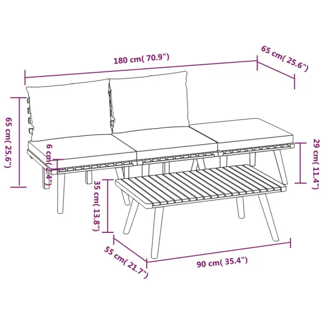 Ta vrtna garnitura je odlična izbira za sproščanje in uživanje v lepem vremenu, za dremanje ali klepetanje z družino ali prijatelji. Lesena sedežna garnitura z brezčasno obliko iz letvic dodaja pridih rustikalnega čara vaši verandi, terasi ali vrtu. Ta komplet zunanjega pohištva iz trdnega akacijevega lesa je vremensko odporen in zelo trpežen. V kombinaciji z debelo podloženimi blazinami ta sedežna garnitura za teraso zagotavlja najvišjo raven udobja. Kombinirate jo lahko tudi z drugimi modularnimi segmenti in tako ustvarite svojo lastno sedežno garnituro! Opomba: Da bi podaljšali življenjsko dobo vašega zunanjega pohištva, vam priporočamo, da ga zaščitite z vodoodporno prevleko.Barva blazine: Temno siva, belaMaterial: Trden akacijev les, blago (100 % poliester)Dimenzije stolčka za noge: 60 x 60 x 29 cm (Š x G x V)Dimenzije mizice: 90 x 55 x 35 cm (Š x G x V)Dimenzije blazine za sedež: 54 x 58,5 x 6 cm (Š x G x D)Dimenzije hrbtne blazine: 40 x 40 x 10 cm (Š x G x D)Sredinski kavč:Dimenzije sredinskega kavča: 60 x 65 x 65 cm (Š x G x V)Globina sedeža: 60 cmVišina sedeža (brez blazine): 29 cmVišina sedeža (vključno z blazino): 35 cmPotrebno sestavljanje: DaPaket vsebuje:2 x Sredinski kavč1 x Stolček za noge1 x Miza3 x Blazina za sedež2 x Blazina za hrbet