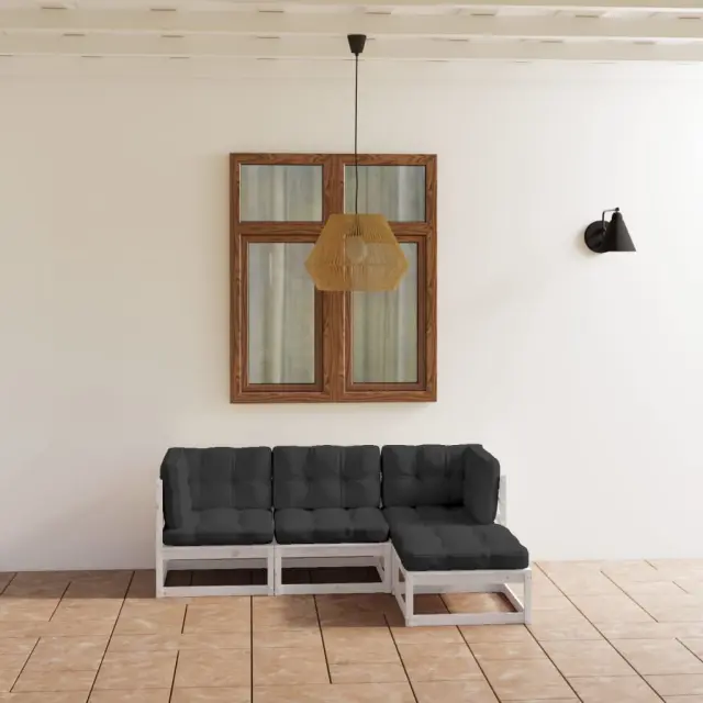 Ta vrtna garnitura je odlična izbira za sproščanje in uživanje v lepem vremenu, za dremanje ali klepetanje z družino ali prijatelji. Vrtna sedežna garnitura je izdelana iz trdne borovine, zato je močna in stabilna. Blazine prispevajo k dodatnemu udobju. Izdelek lahko kombinirate z drugimi modularnimi segmenti in tako ustvarite svojo lastno vrtno sedežno garnituro! Opomba: Da bi podaljšali življenjsko dobo vašega zunanjega pohištva, vam priporočamo, da ga zaščitite z vodoodporno prevleko.Barva: BelaBarva blazin: AntracitnaMaterial: Trdna borovina, blago (100 % poliester)Dimenzije sredinskega / kotnega kavča: 70 x 70 x 67 cm (Š x G x V)Dimenzije stolčka za noge: 70 x 70 x 30 cm (Š x G x V)Dimenzije sedežne blazine: 70 x 70 x 8 cm (D x Š x D)Dimenzije blazine za hrbet / stranske blazine: 70 x 40 x 8 cm (D x Š x D)Potrebno sestavljanje: DaMaksimalna nosilnost (na sedež): 110 kgPaket vsebuje:1 x Sredinski kavč2 x Kotni kavč1 x Stolček za noge4 x Blazina za sedež5 x Blazina za hrbet/stranska blazina Največ 110 kg na sedež.