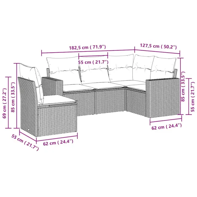 Ta vrtna sedežna garnitura je popoln dodatek za vaše dvorišče, teraso ali verando, saj zagotavlja udoben in vabljiv prostor za klepet z družino in prijatelji ali preprosto za sprostitev in uživanje na prostem. Vzdržljiv material: PE ratan, znan tudi kot poli ratan, je močan sintetični material, ki zahteva malo vzdrževanja in je videti kot naravni ratan. Je lahek, enostaven za čiščenje in se zaradi svoje vzdržljivosti in odpornosti na vremenske vplive pogosto uporablja za zunanje pohištvo.Udobno sedenje: To zunanje pohištvo z debelo oblazinjenimi blazinami zagotavlja udobno sedenje. Široki nasloni za roke so tudi priročen prostor za mobilni telefon, skodelice ali druge manjše predmete, da jih lahko zlahka dosežete.Prevleko je mogoče odstraniti in oprati: Te sedežne blazine imajo odstranljive prevleke za lažje pranje in vzdrževanje.Modularna zasnova: Ta komplet zunanjega pohištva ima modularno zasnovo, zaradi česar je popolnoma prilagodljiv in enostaven za premikanje, tako da lahko zunanjo garnituro postavite kakor koli želite. Dobro je vedeti:Če želite, da vaše zunanje pohištvo ostane lepo, vam priporočamo, da ga zaščitite z vodoodporno prevleko.Maksimalna nosilnost (na sedež): 110 kgUV-odpornoPlastične nastavljive nogePotrebno sestavljanje: DaKotni sedež s širokim naslonom za roke:Barva: Svetlo sivaMaterial: PE ratan, jeklen okvir s prašnim premazomDimenzije: 65,5 x 62 x 69 cm (Š x G x V)Velikost sedeža: 55 x 55 cm (Š x G)Višina sedeža, merjena od tal: 37 cmVišina naslonjal za roke od tal: 55 cmŠirina naslonjala za roke: 10 cmKotni sedež:Barva: Svetlo sivaMaterial: PE ratan, jeklen okvir s prašnim premazomDimenzije: 62 x 62 x 69 cm (Š x G x V)Velikost sedeža: 55 x 55 cm (Š x G)Višina sedeža, merjena od tal: 37 cmSrednji sedež:Barva: Svetlo sivaMaterial: PE ratan, jeklen okvir s prašnim premazomDimenzije: 55 x 62 x 69 cm (Š x G x V)Velikost sedeža: 55 x 55 cm (Š x G)Višina sedeža, merjena od tal: 37 cmBlazina:Barva: Temno sivaMaterial prevleke: Tkanina (100 % poliester)Polnilo sedežne blazine: PenaPolnilo hrbtne blazine: bombažna vlaknaDimenzije sedežne blazine: 55 x 55 x 3 cm (Š x G x D)Dimenzije hrbtne blazine: 55 x 45 x 13 cm (D x Š x D)Paket vsebuje:2 x Kotni sedež s širokim naslonom za roke1 x Kotni sedež2 x Sredinski sedež6 x Blazina za hrbet5 x Sedežna blazina s snemljivo pralno prevleko