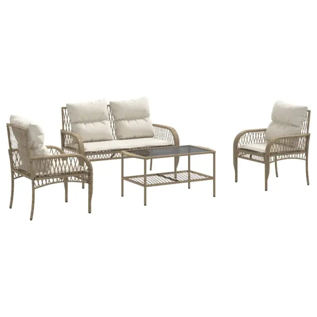 Ta vrtna sedežna garnitura je popoln dodatek za vaše dvorišče, teraso ali verando, saj zagotavlja udoben in vabljiv prostor za klepet z družino in prijatelji ali preprosto za sprostitev in uživanje na prostem. Vzdržljiv material: PE ratan, znan tudi kot poli ratan, je močan sintetični material, ki zahteva malo vzdrževanja in je videti kot naravni ratan. Je lahek, enostaven za čiščenje in se zaradi svoje vzdržljivosti in odpornosti na vremenske vplive pogosto uporablja za zunanje pohištvo.Robusten in stabilen okvir: Prašno barvan jekleni okvir zagotavlja, da je vrtno pohištvo močno in stabilno za vsakodnevno uporabo na prostem.Udobno sedenje: To zunanje pohištvo z debelo oblazinjenimi blazinami zagotavlja udobno sedenje.Prevleko je mogoče odstraniti in oprati: Te sedežne blazine imajo odstranljive prevleke za lažje pranje in vzdrževanje.Steklena mizna plošča: Površina zunanje mize je izdelana iz močnega in trpežnega kaljenega stekla, kar omogoča enostavno čiščenje z vlažno krpo in vašemu zunanjemu prostoru doda pridih elegance. Dobro je vedeti:Če želite, da vaše zunanje pohištvo ostane lepo, vam priporočamo, da ga zaščitite z vodoodporno prevleko.Maksimalna nosilnost (na sedež): 110 kgUV-odpornoPotrebno sestavljanje: DaKavč dvosed:Barva: BežMaterial: PE ratan, jeklen okvir s prašnim premazomDimenzije: 122 x 57 x 78 cm (Š x G x V)Velikost sedeža: 110 x 50 cm (Š x G)Višina sedeža, merjena od tal: 36 cmVišina naslonjala za roke od tal: 54,5 cmKavč z naslonjali za roke:Barva: BežMaterial: PE ratan, jeklen okvir s prašnim premazomDimenzije: 63 x 57 x 78 cm (Š x G x V)Velikost sedeža: 51 x 50 cm (Š x G)Višina sedeža, merjena od tal: 36 cmVišina naslonjala za roke od tal: 54,5 cmKlubska mizica:Barva: BežMaterial: PE ratan, jeklo s prašnim premazom, kaljeno stekloDimenzije: 90 x 48 x 46 cm (Š x G x V)Blazina:Barva: Kremno belaMaterial prevleke: Tkanina (100 % poliester)Polnilo hrbtne blazine: bombažna vlaknaPolnilo sedežne blazine: Pena in vlaknaDimenzije blazine za hrbet: 46,5 x 47 x 10 cm (Š x G x D)Dimenzije sedežne blazine (dvosedežni kavč): 110 x 50 x 3 cm (Š x G x D)Dimenzije sedežne blazine (naslanjač): 50 x 50 x 3 cm (Š x G x D)Paket vsebuje:1 x Kavč dvosed2 x Kavč z naslonjali za roke1 x Klubska mizica6 x Sedežna blazina s snemljivo pralno prevleko4 x Blazina za hrbet