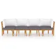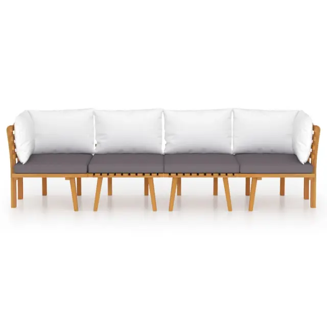 Ta vrtna garnitura je odlična izbira za sproščanje in uživanje v lepem vremenu, za dremanje ali klepetanje z družino ali prijatelji. Lesena sedežna garnitura z brezčasno obliko iz letvic dodaja pridih rustikalnega čara vaši verandi, terasi ali vrtu. Ta komplet zunanjega pohištva iz trdnega akacijevega lesa je vremensko odporen in zelo trpežen. V kombinaciji z debelo podloženimi blazinami ta sedežna garnitura za teraso zagotavlja najvišjo raven udobja. Kombinirate jo lahko tudi z drugimi modularnimi segmenti in tako ustvarite svojo lastno sedežno garnituro! Opomba: Da bi podaljšali življenjsko dobo vašega zunanjega pohištva, vam priporočamo, da ga zaščitite z vodoodporno prevleko.Barva blazine: Temno siva, belaMaterial: Trden akacijev les, blago (100 % poliester)Dimenzije blazine za sedež: 54 x 58,5 x 6 cm (Š x G x D)Dimenzije hrbtne blazine: 40 x 40 x 10 cm (Š x G x D)Sredinski kavč:Dimenzije sredinskega kavča: 60 x 65 x 65 cm (Š x G x V)Globina sedeža: 60 cmVišina sedeža (brez blazine): 29 cmVišina sedeža (vključno z blazino): 35 cmKotni kavč:Dimenzije kotnega kavča: 65 x 65 x 65 cm (Š x G x V)Globina sedeža: 60 cmVišina sedeža (brez blazine): 29 cmVišina sedeža (vključno z blazino): 35 cmPotrebno sestavljanje: DaOpomba: Miza ni priloženaPaket vsebuje:2 x Sredinski kavč2 x Kotni kavč4 x Blazina za sedež6 x Blazina za hrbet