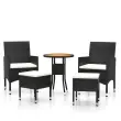 S to vrtno sedežno garnituro lahko ob bazen, na verando, teraso ali balkon dodate pridih modernega stila. Zunanja sedežna garnitura ima prašno premazan jeklen okvir, ki je oblečen v poli ratan. Mizna plošča je izdelana iz trdnega akacijevega lesa, trdega lesa z gostimi vzorci. Debelo podložena sedežna blazina stolu dodaja udobje. Opomba: Da bi podaljšali življenjsko dobo vašega zunanjega pohištva, vam priporočamo, da ga zaščitite z vodoodporno prevleko.Miza:Barva: ČrnaMaterial: Poli ratan, jeklo s prašnim premazom, trden akacijev lesDimenzije: 60 x 75 cm (premer x V)Z zaščitno gumo za lesStol in stolček:Barva PE ratana: ČrnaBarva blazin: Kremno belaMaterial: Poli ratan, jeklo s prašnim premazom, blago (100 % poliester)Dimenzije stola: 53 x 58 x 84 cm (Š x G x V)Velikost sedeža: 39/44,5 x 46 cm (Š x G)Višina sedeža, merjena od tal: 42 cmVišina naslonjala za roke, merjena od tal: 62/65 cmDimenzije stolčka: 41,5 x 41,5 x 42,5 cm (Š x G x V)Potrebno sestavljanje: DaPaket vsebuje:1 x Miza2 x Stol2 x Stolček4 x Blazina za sedež Maksimalna teža na sedež: 110 kg. Bodite pozorni na tveganje odprtega ognja in druge vire močne toplote v bližini izdelka.