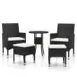 S to vrtno sedežno garnituro lahko ob bazen, na verando, teraso ali balkon dodate pridih modernega stila. Zunanja sedežna garnitura ima prašno premazan jeklen okvir, ki je oblečen v poli ratan. Mizna plošča je izdelana iz kaljenega stekla, zaradi česar je enostavna za čiščenje. Debelo podložena sedežna blazina stolu dodaja udobje. Opomba: Da bi podaljšali življenjsko dobo vašega zunanjega pohištva, vam priporočamo, da ga zaščitite z vodoodporno prevleko.Miza:Barva: ČrnaMaterial: Poli ratan, prašno premazano jeklo, kaljeno stekloDimenzije: 60 x 75 cm (premer x V)Debelina stekla: 5 mmZ zaščitno gumo za stekloStol in stolček:Barva PE ratana: ČrnaBarva blazin: Kremno belaMaterial: Poli ratan, jeklo s prašnim premazom, blago (100 % poliester)Dimenzije stola: 53 x 58 x 84 cm (Š x G x V)Velikost sedeža: 39/44,5 x 46 cm (Š x G)Višina sedeža, merjena od tal: 42 cmVišina naslonjala za roke, merjena od tal: 62/65 cmDimenzije stolčka: 41,5 x 41,5 x 42,5 cm (Š x G x V)Potrebno sestavljanje: DaPaket vsebuje:1 x Miza2 x Stol2 x Stolček4 x Blazina za sedež Maksimalna teža na sedež: 110 kg. Bodite pozorni na tveganje odprtega ognja in druge vire močne toplote v bližini izdelka.