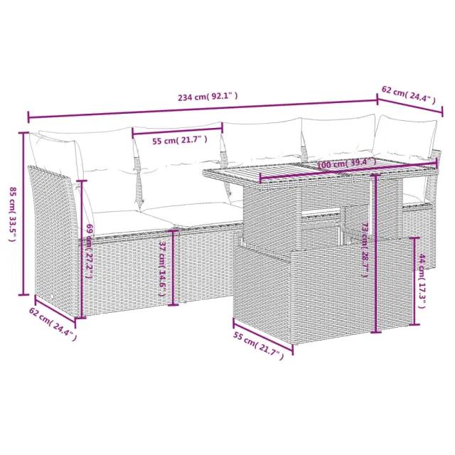 Ta vrtna sedežna garnitura je popoln dodatek za vaše dvorišče, teraso ali verando, saj zagotavlja udoben in vabljiv prostor za klepet z družino in prijatelji ali preprosto za sprostitev in uživanje na prostem. Vzdržljiv material: PE ratan, znan tudi kot poli ratan, je močan sintetični material, ki zahteva malo vzdrževanja in je videti kot naravni ratan. Je lahek, enostaven za čiščenje in se zaradi svoje vzdržljivosti in odpornosti na vremenske vplive pogosto uporablja za zunanje pohištvo.Nastavljiva mizna plošča: Z dvigom mizne plošče lahko mizo povišate, s čimer se zunanja klubska mizica spremeni v jedilno mizo. Popolna je za sprejemanje gostov ali uživanje v obrokih na prostem.Udobno sedenje: To zunanje pohištvo z debelo oblazinjenimi blazinami zagotavlja udobno sedenje.Prevleko je mogoče odstraniti in oprati: Te sedežne blazine imajo odstranljive prevleke za lažje pranje in vzdrževanje.Modularna zasnova: Ta komplet zunanjega pohištva ima modularno zasnovo, zaradi česar je popolnoma prilagodljiv in enostaven za premikanje, tako da lahko zunanjo garnituro postavite kakor koli želite. Dobro je vedeti:Če želite, da vaše zunanje pohištvo ostane lepo, vam priporočamo, da ga zaščitite z vodoodporno prevleko.Maksimalna nosilnost (na sedež): 110 kgUV-odpornoPlastične nastavljive nogePotrebno sestavljanje: DaKotni sedež:Barva: ČrnaMaterial: PE ratan, jeklen okvir s prašnim premazomDimenzije: 62 x 62 x 69 cm (Š x G x V)Velikost sedeža: 55 x 55 cm (Š x G)Višina sedeža, merjena od tal: 37 cmSrednji sedež:Barva: ČrnaMaterial: PE ratan, jeklen okvir s prašnim premazomDimenzije: 55 x 62 x 69 cm (Š x G x V)Velikost sedeža: 55 x 55 cm (Š x G)Višina sedeža, merjena od tal: 37 cmMiza:Barva: ČrnaMaterial: PE ratan, prašno premazano jeklo, trden akacijev les z oljnim premazomDimenzije: 100 x 55 x 44/73 cm (Š x G x V)Blazina:Barva: Kremno belaMaterial prevleke: Tkanina (100 % poliester)Polnilo sedežne blazine: PenaPolnilo hrbtne blazine: bombažna vlaknaDimenzije sedežne blazine: 55 x 55 x 3 cm (Š x G x D)Dimenzije hrbtne blazine: 55 x 45 x 13 cm (D x Š x D)Paket vsebuje:2 x Kotni sedež2 x Sredinski sedež1 x Miza6 x Blazina za hrbet4 x Sedežna blazina s snemljivo in pralno prevleko