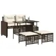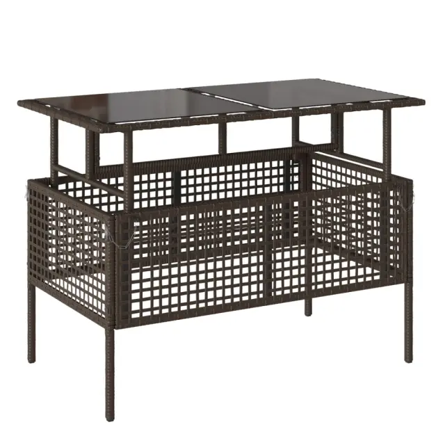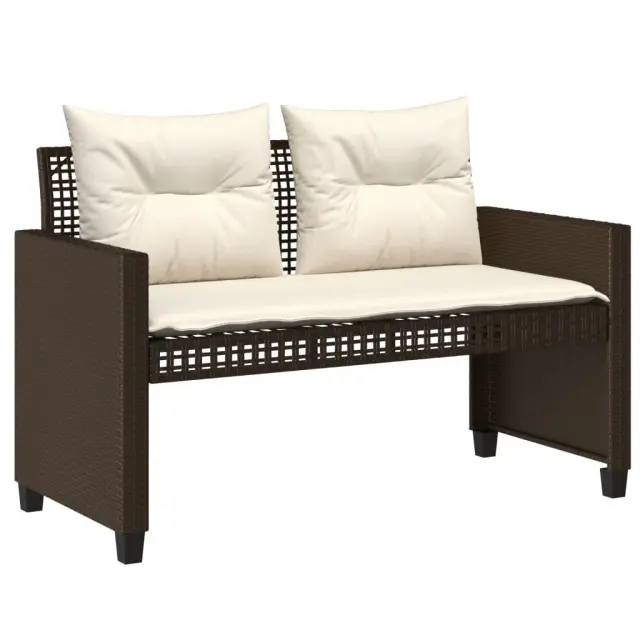Ta vrtna sedežna garnitura je popoln dodatek za vaše dvorišče, teraso ali verando, saj zagotavlja udoben in vabljiv prostor za klepet z družino in prijatelji ali preprosto za sprostitev in uživanje na prostem. Vzdržljiv material: PE ratan, znan tudi kot poli ratan, je močan sintetični material, ki zahteva malo vzdrževanja in je videti kot naravni ratan. Je lahek, enostaven za čiščenje in se zaradi svoje vzdržljivosti in odpornosti na vremenske vplive pogosto uporablja za zunanje pohištvo.Nastavljiva mizna plošča: Z dvigom mizne plošče lahko mizo povišate, s čimer se zunanja klubska mizica spremeni v jedilno mizo. Popolna je za sprejemanje gostov ali uživanje v obrokih na prostem.Udobno sedenje: Zunanje pohištvo z debelo oblazinjenimi blazinami zagotavlja udobno sedenje.Prevleko je mogoče odstraniti in oprati: Te sedežne blazine imajo odstranljive prevleke za lažje pranje in vzdrževanje.Steklena mizna plošča: Površina zunanje mize je izdelana iz močnega in trpežnega kaljenega stekla, kar omogoča enostavno čiščenje z vlažno krpo in vašemu zunanjemu prostoru doda pridih elegance. Dobro je vedeti:Če želite, da vaše zunanje pohištvo ostane lepo, vam priporočamo, da ga zaščitite z vodoodporno prevleko.Maksimalna nosilnost (na sedež): 110 kgUV-odpornoPotrebno sestavljanje: DaVrtna klop:Barva: RjavaMaterial: PE ratan, jeklen okvir s prašnim premazomDimenzije: 122 x 57 x 79 cm (Š x G x V)Velikost sedeža: 110 x 53 cm (Š x G)Višina sedeža od tal: 45 cmVišina naslonjala za roke, merjena od tal: 62 cmVrtna miza:Barva: RjavaMaterial: PE ratan, jeklo s prašnim premazom, kaljeno stekloDimenzije: 90 x 50 x 50/72 cm (D x Š x V)Stolček za noge:Barva: RjavaMaterial: PE ratan, jeklen okvir s prašnim premazomDimenzije: 50 x 50 x 35 cm (Š x G x V)Blazina:Barva: Kremno belaMaterial prevleke: Tkanina (100 % poliester)Polnilo sedežne blazine: PenaPolnilo hrbtne blazine: bombažna vlaknaDimenzije sedeža klopi: 110 x 53 x 3 cm (Š x G x D)Dimenzije hrbtne blazine za klop: 55 x 45 x 10 cm (Š x G x D)Dimenzije blazine stolčka za noge: 50 x 50 x 3 cm (Š x G x D)Paket vsebuje:1 x Vrtna klop1 x Vrtna miza2 x Stolček za noge2 x Blazina za hrbet6 x Sedežna blazina s snemljivo pralno prevleko Največ 110 kg na sedež. Zavedajte se nevarnosti odprtega ognja in drugih virov močne vročine v bližini izdelka.