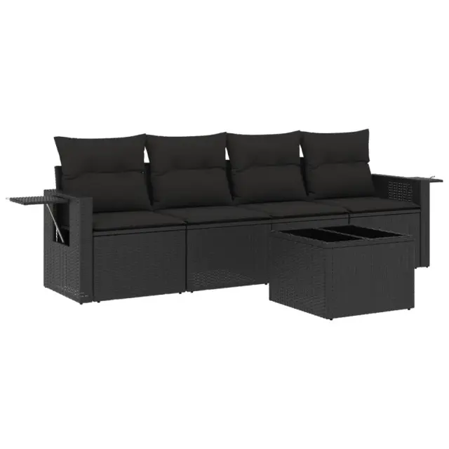 Ta vrtna sedežna garnitura je popoln dodatek za vaše dvorišče, teraso ali verando, saj zagotavlja udoben in vabljiv prostor za klepet z družino in prijatelji ali preprosto za sprostitev in uživanje na prostem. Vzdržljiv material: PE ratan, znan tudi kot poli ratan, je močan sintetični material, ki zahteva malo vzdrževanja in je videti kot naravni ratan. Je lahek, enostaven za čiščenje in se zaradi svoje vzdržljivosti in odpornosti na vremenske vplive pogosto uporablja za zunanje pohištvo.Steklena mizna plošča: Površina zunanje mize je izdelana iz močnega in trpežnega kaljenega stekla, kar omogoča enostavno čiščenje z vlažno krpo in vašemu zunanjemu prostoru doda pridih elegance. Priročna stranska mizica: To zunanje pohištvo ima zložljive stranske mizice s pnevmatsko vzmetjo na naslonjalih za roke, ki zagotavljajo priročen prostor za shranjevanje potrebščin na dosegu roke. Udobno sedenje: To zunanje pohištvo z debelo oblazinjenimi blazinami zagotavlja udobno sedenje.Modularna zasnova: Ta komplet zunanjega pohištva ima modularno zasnovo, zaradi česar je popolnoma prilagodljiv in enostaven za premikanje, tako da lahko zunanjo garnituro postavite kakor koli želite. Dobro je vedeti:Če želite, da vaše zunanje pohištvo ostane lepo, vam priporočamo, da ga zaščitite z vodoodporno prevleko.Maksimalna nosilnost (na sedež): 110 kgUV-odpornoPotrebno sestavljanje: DaSrednji sedež:Barva: ČrnaMaterial: PE ratan, jeklen okvir s prašnim premazomDimenzije: 55 x 62 x 69 cm (Š x G x V)Velikost sedeža: 55 x 55 cm (Š x G)Višina sedeža, merjena od tal: 37 cmKavč z naslonjali za roke:Barva: ČrnaMaterial: PE ratan, jeklen okvir s prašnim premazomDimenzije: 62/85 x 62 x 69 cm (Š x G x V)Velikost sedeža: 55 x 55 cm (Š x G)Višina sedeža, merjena od tal: 37 cmVišina naslonjal za roke od tal: 55 cmVelikost stranske mizice: 25 x 23 cm (D x Š)Miza:Barva: ČrnaMaterial: PE ratan, jeklo s prašnim premazom, kaljeno stekloDimenzije: 55 x 55 x 37 cm (D x Š x V)Blazina:Barva: Črna Material prevleke: Tkanina (100 % poliester)Polnilo sedežne blazine: PenaPolnilo hrbtne blazine: bombažna vlaknaDimenzije sedežne blazine: 55 x 55 x 3 cm (Š x G x D)Dimenzije hrbtne blazine: 55 x 45 x 13 cm (D x Š x D)Paket vsebuje:2 x Sredinski sedež2 x Kavč z naslonjali za roke1 x Vrtna miza4 x Blazina za hrbet4 x Sedežna blazina s snemljivo in pralno prevleko
