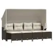 Ta vrtna sedežna garnitura je popoln dodatek za vaše dvorišče, teraso ali verando, saj zagotavlja udoben in vabljiv prostor za klepet z družino in prijatelji ali preprosto za sprostitev in uživanje na prostem. Vzdržljiv material: PE ratan, znan tudi kot poli ratan, je močan sintetični material, ki zahteva malo vzdrževanja in je videti kot naravni ratan. Je lahek, enostaven za čiščenje in se zaradi svoje vzdržljivosti in odpornosti na vremenske vplive pogosto uporablja za zunanje pohištvo.Zložljiv nadstrešek: Zahvaljujoč zložljivi strehi lahko ustvarite hladno in prijetno zunanje okolje čez cel dan.Udobno sedenje: To zunanje pohištvo z debelo oblazinjenimi blazinami zagotavlja udobno sedenje.Vsestranski stolček za noge: Stolček je vsestransko uporaben, saj služi kot udoben naslon za noge, ko ležite na kavču, ali kot dodaten sedež na vrtu.Prevleko je mogoče odstraniti in oprati: Te sedežne blazine imajo odstranljive prevleke za lažje pranje in vzdrževanje. Dobro je vedeti:Če želite, da vaše zunanje pohištvo ostane lepo, vam priporočamo, da ga zaščitite z vodoodporno prevleko.Maksimalna nosilnost (na sedež): 110 kgUV-odpornoPotrebno sestavljanje: DaKavč štirised s streho:Barva: RjavaMaterial: PE ratan, jeklen okvir s prašnim premazomDimenzije s streho: 204 x 75 x 140 cm (Š x G x V)Dimenzije brez strehe: 204 x 55 x 69,5 cm (Š x G x V)Velikost sedeža: 200 x 52,5 cm (Š x G)Višina sedeža, merjena od tal: 36,5 cmVišina naslonjala za roke od tal: 56,5 cmStolček za noge:Barva: RjavaMaterial: PE ratan, jeklen okvir s prašnim premazomDimenzije (vsak): 50 x 48 x 36,5 cm (Š x G x V)Velikost sedeža: 50 x 48 cm (Š x G)Višina sedeža od tal (brez blazine): 36,5 cmBlazina:Barva: Kremno belaMaterial prevleke: Tkanina (100 % poliester)Polnilo sedežne blazine: PenaPolnilo hrbtne blazine: bombažna vlaknaDimenzije sedežne blazine (kavč štirised): 200 x 52,5 x 3 cm (Š x G x D)Dimenzije sedežne blazine (stolček za noge): 51 x 48 x 3 cm (Š x G x D)Dimenzije hrbtne blazine: 50 x 42 x 10 cm (D x Š x D)Paket vsebuje:1 x Kavč štirised s streho4 x Stolček za noge5 x Sedežna blazina s snemljivo pralno prevleko4 x Blazina za hrbet