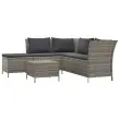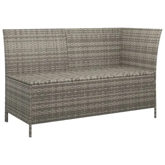 Elegantna in sodobna vrtna sedežna garnitura je popolna izbira za obedovanje ali sproščanje na vašem vrtu. Vzdržljiv material: Poli ratan je izjemno odporen material, ki je vzdržljiv v različnih vremenskih razmerah. Potrebuje malo vzdrževanja. Jeklen okvir garniture vrtnega pohištva zagotavlja trdnost in stabilnost. Veliko prostora za shranjevanje: Prostor za shranjevanje v kotni sedežni garnituri omogoča organizirano shranjevanje stvari. Primerno za shranjevanje blazin, vzglavnikov, odej, igrač in drugih predmetov. Vodoodporna vreča: V notranjosti kotnega kavča je vodoodporna vreča, ki varuje vaše stvari in jih ščiti pred vlago.Udobna izkušnja sedenja: Za vaše udobje so priložene dodatne blazine. Dobro je vedeti:Priporočamo vam, da sedežno garnituro zaščitite z nepremočljivo prevleko in tako podaljšate življenjsko dobo svojega zunanjega pohištva. Vsakemu izdelku so priložena navodila za enostavno sestavljanje in uporabo.Barva: Siva Barva blazine in vzglavnika: Temno sivaMaterial: Poli ratan, jeklo s prašnim premazom, blago (100 % poliester) Material polnila: Pena Mere kotne sedežne: 110 x 58 x 72 cm (Š x G x V) Dimenzije stolčka: 49 x 49 x 35 cm (Š x G x V) Dimenzije klubske mizice: 43 x 43 x 30,5 cm (Š x G x V) Dimenzije sedežne blazine (vsaka): 49 x 49 x 3 cm (Š x G x D) Mere blazine (vsaka): 50 x 40 cm (Š x G) Paket vsebuje:2 x Kotni kavč 1 x Stolček 1 x Klubska mizica 5 x Blazina za sedež 4 x Blazina za hrbet