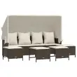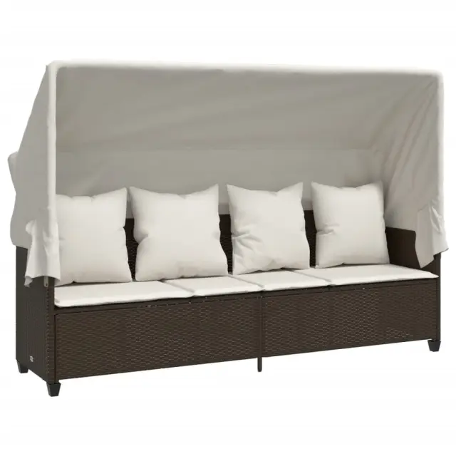 Ta vrtna sedežna garnitura je popoln dodatek za vaše dvorišče, teraso ali verando, saj zagotavlja udoben in vabljiv prostor za klepet z družino in prijatelji ali preprosto za sprostitev in uživanje na prostem. Vzdržljiv material: PE ratan, znan tudi kot poli ratan, je močan sintetični material, ki zahteva malo vzdrževanja in je videti kot naravni ratan. Je lahek, enostaven za čiščenje in se zaradi svoje vzdržljivosti in odpornosti na vremenske vplive pogosto uporablja za zunanje pohištvo.Nastavljivo naslonjalo: To zunanje pohištvo ima naslonjalo za hrbet s 3 nastavljivimi položaji in naslonjalo za noge z 2 nastavljivima položajema, kar vam omogoča, da zlahka najdete najudobnejši in najprimernejši položaj za sprostitev.Zložljiv nadstrešek: Zahvaljujoč zložljivi strehi lahko ustvarite hladno in prijetno zunanje okolje čez cel dan.Udobno sedenje: To zunanje pohištvo z debelo oblazinjenimi blazinami zagotavlja udobno sedenje.Vsestranski stolček za noge: Stolček je vsestransko uporaben, saj služi kot udoben naslon za noge, ko ležite na kavču, ali kot dodaten sedež na vrtu. Dobro je vedeti:Če želite, da vaše zunanje pohištvo ostane lepo, vam priporočamo, da ga zaščitite z vodoodporno prevleko.Maksimalna nosilnost (na sedež): 110 kgUV-odpornoPotrebno sestavljanje: DaKavč štirised s streho:Barva: RjavaMaterial: PE ratan, jeklen okvir s prašnim premazomDimenzije s streho: 204 x 75 x 140 cm (Š x G x V)Dimenzije brez strehe: 204 x 55 x 69,5 cm (Š x G x V)Velikost sedeža: 200 x 52,5 cm (Š x G)Višina sedeža, merjena od tal: 36,5 cmNastavljiva višina naslonjala: 63/74/84 cmNastavljiva višina podnožja: 58/64 cmVišina naslonjala za roke od tal: 56,5 cmStolček za noge:Barva: RjavaMaterial: PE ratan, jeklen okvir s prašnim premazomDimenzije (vsak): 50 x 48 x 36,5 cm (Š x G x V)Velikost sedeža: 50 x 48 cm (Š x G)Višina sedeža od tal (brez blazine): 36,5 cmBlazina:Barva: Kremno belaMaterial prevleke: Tkanina (100 % poliester)Polnilo sedežne blazine: PenaPolnilo hrbtne blazine: bombažna vlaknaDimenzije sedežne blazine (kavč štirised): 200 x 52,5 x 3 cm (Š x G x D)Dimenzije sedežne blazine (stolček za noge): 51 x 48 x 3 cm (Š x G x D)Dimenzije hrbtne blazine: 45 x 45 x 10 cm (D x Š x D)Paket vsebuje:1 x Kavč štirised s streho4 x Stolček za noge5 x Sedežna blazina s snemljivo pralno prevleko4 x Blazina za hrbet