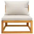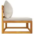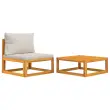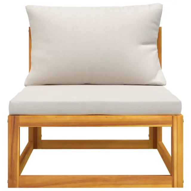 Ta lesena vrtna sedežna garnitura z blazinami bo popolna izbira za kofetkanje in počivanje. Trden akacijev les: Ta sedežna garnitura je izdelana iz trdnega akacijevega lesa. Trden akacijev les je čudovit naravni material. Akacijev les je tropski trden les, ki je gost, močan in vzdržljiv.Idealna miza za prosti čas: Priložena klubska mizica vam omogoča, da imate prigrizke, pijačo, revije itd. na dosegu roke.Udobna izkušnja sedenja: Priložene blazine so zaradi prevleke in debelega oblazinjenja mehke in zagotavljajo največje udobje.Modularna zasnova: Zunanja sedežna garnitura je prilagodljiva in enostavna za premikanje, zato jo lahko kombinirate z drugimi modularnimi segmenti v spletni trgovini in tako ustvarite svoje osebne konfiguracije vrtne sedežne garniture! Dobro je vedeti:Za čim lažjo montažo je vsakemu izdelku priložen priročnik.Opomba:Če želite, da vaše zunanje pohištvo ostane lepo, vam priporočamo, da ga zaščitite z vodoodporno prevleko.Material: Trden akacijev les z oljnim premazomSredinski kavč:Dimenzije: 68 x 70,5 x 65 cm (Š x G x V)Višina sedeža, merjena od tal (brez blazine): 29 cmMaksimalna nosilnost: 110 kgBlazina:Barva blazine: Svetlo sivaMaterial prevlek za blazine: Tkanina (100 % poliester)Polnilo hrbtne blazine: 100 % bombažna vlaknaPolnilo sedežne blazine: Pena, bombažna vlaknaDimenzije blazine za sedež: 68 x 68 x 6 cm (D x Š x D)Dimenzije hrbtne blazine: 68 x 45 x 15 cm (D x Š x D)Klubska mizica:Dimenzije: 68 x 68 x 29 cm (Š x G x V)Paket vsebuje:1 x Sredinski kavč1 x Klubska mizica1 x Blazina za sedež1 x Blazina za hrbet Največ 110 kg na sedež.