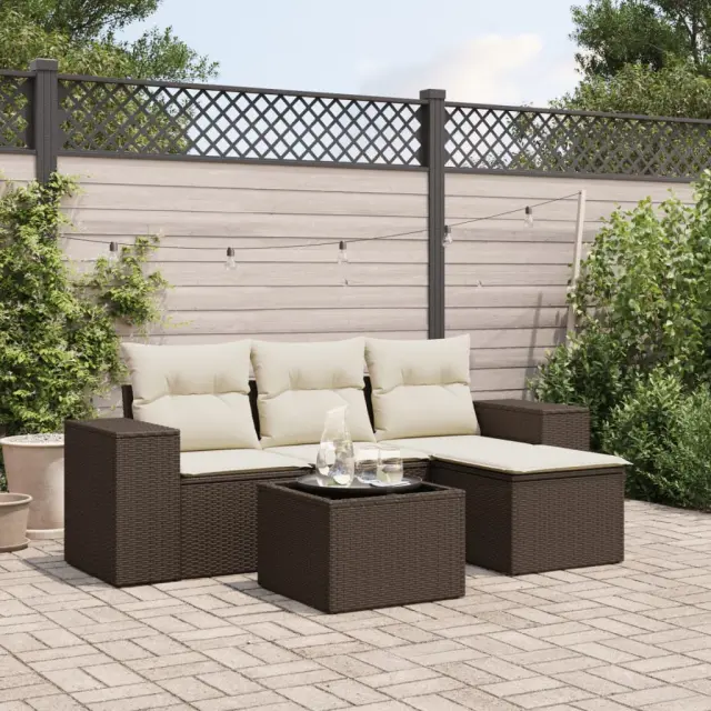 Ta vrtna sedežna garnitura je popoln dodatek za vaše dvorišče, teraso ali verando, saj zagotavlja udoben in vabljiv prostor za klepet z družino in prijatelji ali preprosto za sprostitev in uživanje na prostem. Vzdržljiv material: PE ratan, znan tudi kot poli ratan, je močan sintetični material, ki zahteva malo vzdrževanja in je videti kot naravni ratan. Je lahek, enostaven za čiščenje in se zaradi svoje vzdržljivosti in odpornosti na vremenske vplive pogosto uporablja za zunanje pohištvo.Steklena mizna plošča: Površina zunanje mize je izdelana iz močnega in trpežnega kaljenega stekla, kar omogoča enostavno čiščenje z vlažno krpo in vašemu zunanjemu prostoru doda pridih elegance.Udobno sedenje: To zunanje pohištvo z debelo oblazinjenimi blazinami zagotavlja udobno sedenje.Prevleko je mogoče odstraniti in oprati: Te sedežne blazine imajo odstranljive prevleke za lažje pranje in vzdrževanje.Modularna zasnova: Ta komplet zunanjega pohištva ima modularno zasnovo, zaradi česar je popolnoma prilagodljiv in enostaven za premikanje, tako da lahko zunanjo garnituro postavite kakor koli želite. Dobro je vedeti:Če želite, da vaše zunanje pohištvo ostane lepo, vam priporočamo, da ga zaščitite z vodoodporno prevleko.Maksimalna nosilnost (na sedež): 110 kgUV-odpornoPlastične nastavljive nogePotrebno sestavljanje: DaSrednji sedež:Barva: RjavaMaterial: PE ratan, jeklen okvir s prašnim premazomDimenzije: 55 x 62 x 69 cm (Š x G x V)Velikost sedeža: 55 x 55 cm (Š x G)Višina sedeža, merjena od tal: 37 cmKavč z naslonjali za roke:Barva: RjavaMaterial: PE ratan, jeklen okvir s prašnim premazomDimenzije: 83 x 62 x 69 cm (Š x G x V)Velikost sedeža: 55 x 55 cm (Š x G)Višina sedeža, merjena od tal: 37 cmVišina naslonjal za roke od tal: 55 cmŠirina naslona za roke: 27,5 cmStolček za noge:Barva: RjavaMaterial: PE ratan, jeklen okvir s prašnim premazomDimenzije: 55 x 55 x 37 cm (Š x G x V)Velikost sedeža: 55 x 55 cm (Š x G)Višina sedeža, merjena od tal: 37 cmMiza:Barva: RjavaMaterial: PE ratan, jeklo s prašnim premazom, kaljeno stekloDimenzije: 55 x 55 x 37 cm (D x Š x V)Blazina:Barva: Kremno belaMaterial prevleke: Tkanina (100 % poliester)Polnilo sedežne blazine: PenaPolnilo hrbtne blazine: bombažna vlaknaDimenzije sedežne blazine: 55 x 55 x 3 cm (Š x G x D)Dimenzije hrbtne blazine: 55 x 45 x 13 cm (D x Š x D)Paket vsebuje:1 x Sredinski sedež2 x Kavč z naslonjali za roke1 x Stolček za noge1 x Vrtna miza3 x Blazina za hrbet4 x Sedežna blazina s snemljivo in pralno prevleko