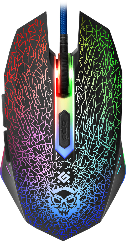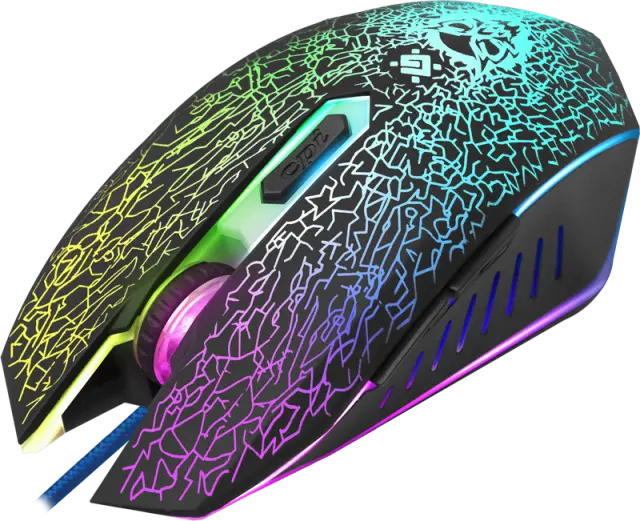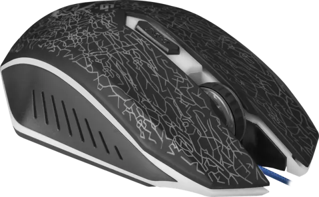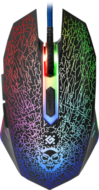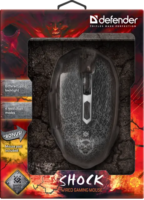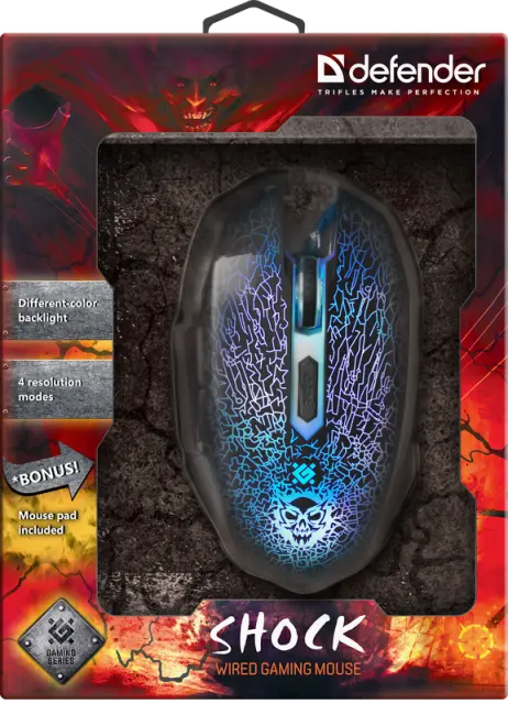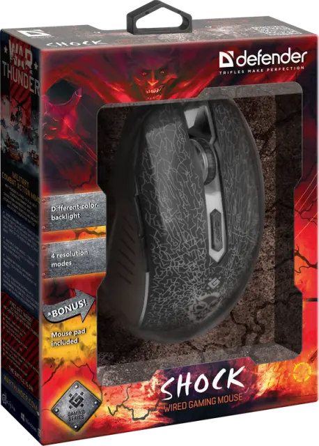 Žična miška Defender SHOCK GM-110L črna s premazom proti zdrsu je zmogljiva igralna naprava, ki udobno leži v roki. Izgleda elegantno in ga dopolnjuje večbarvna osvetlitev ozadja. Model ima 6 gumbov, med katerimi je 5 programabilnih, pa tudi feritni hrupni filter. Optični LED senzor deluje v načinih 800, 1800, 2400, 3200 dpi.