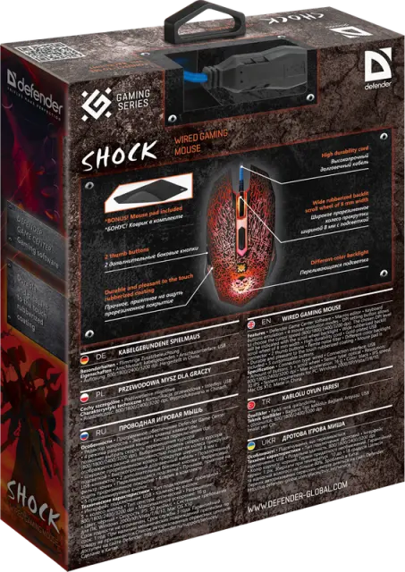 Ena od prednosti žične miške Defender SHOCK GM-110L je njena vsestranskost: igralno napravo lahko uporabljate z desno in levo roko. Model prejema napajanje preko vodila prek kabla in pozlačenega USB priključka. Paket vsebuje črno gumirano podlogo za miško.