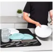 Protidrsna in toplotno odporna: Protidrsna površina te silikonske podloge za sušenje posode ohranja posodo in steklovino varno na mestu, preprečuje nenamerne zdrse in lomljenje. Njene toplotno odporne lastnosti vam omogočajo, da varno postavite vroče lonce in ponve neposredno na podlogo, ne da bi poškodovali vašo kuhinjsko površino. Ta vsestranska podloga ni samo funkcionalna, ampak tudi doda pridih sloga vaši kuhinjski dekoraciji. Njena prilagodljiva oblika omogoča enostavno shranjevanje, ko ni v uporabi, zaradi česar je praktična in prostorsko varčna rešitev za vsako kuhinjo. Podlogo je tudi enostavno očistiti, preprosto jo sperite z milom in vodo ali jo postavite v pomivalni stroj za enostavno vzdrževanje.