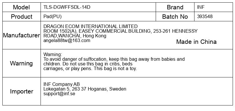 Opozorilo: Da preprečite nevarnost zadušitve, hranite to torbo stran od dojenčkov in otrok. Te vrečke ne uporabljajte v otroških posteljah, posteljnih vozičkih ali igralih. Ta torba ni igrača.