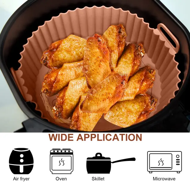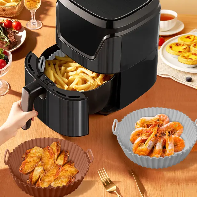 Če hrano postavite v posodo, se izognete lepljivim in zažganim ostankom v vašem Airfryerju. Praktičen dizajn z visokim robom. Olajša tudi vnos in iznašanje hrane. Posoda je narejena iz silikona za živila, ki ga je enostavno vzdrževati. Lahko se pere v pomivalnem stroju.
