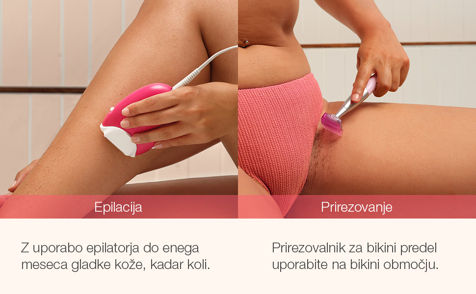Epilirajte in prirežite: opremljen s prirezovalnikom za bikini predel, ki omogoča uporabo na občutljivih območjih.