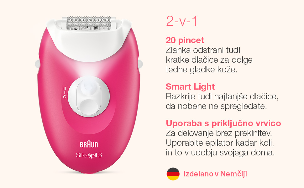 Nadgradite svoje odstranjevanje dlačic z voskanja na epilacijo z aparatom Braun Silk-épil 3. Sprejmite lahkotnost in učinkovitost uporabe epilatorja in pozabite na nered in umazanijo po uporabi voska. Odkrijte zadovoljstvo ob dolgotrajno gladki koži z Braunovo preizkušeno tehnologijo. Zasnovan, da traja vrsto let: naši epilatorji so izdelani v Nemčiji.